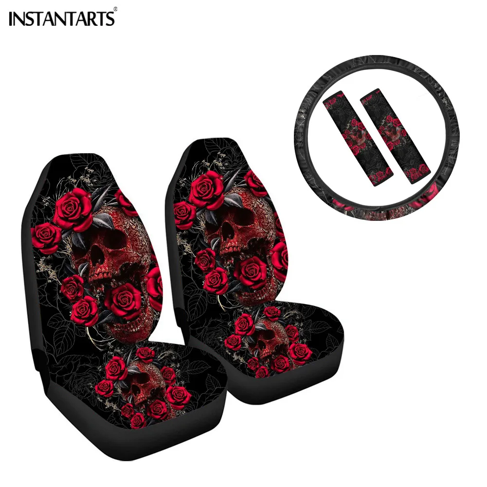 INSTANTARTS, красная роза, 3D Рисунок черепа, Дамское автомобильное сиденье, протектор для автомобильного сиденья, прочный чехол на руль, автомобильные сиденья, 5 шт.