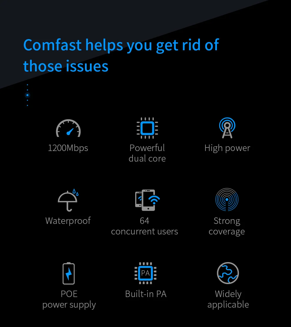 Comfast поможет вам избавиться от проблем с Wi-Fi, таких как ржавый металл, потеря пакетов, узкий диапазон, сложная сборка, многолюдные пользователи, медленная сеть и т. д.