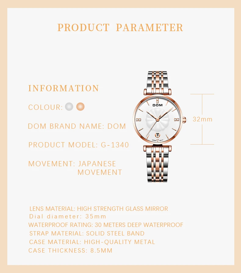 Основная особенность:-100% новый с биркой и высоким качеством, Официальный продукт-Модель: G-1342DG-7M-Дисплей: кварцевые женские часы-Стиль: Модный, Повседневный, роскошный, простой-Зеркало: минеральное укрепленное стеклянное зеркало-Чехол для часов: качественный чехол из цинкового сплава-Ремешок: высококачественный ремешок из нержавеющей стали-Застежка: Пряжка-бабочка-Особенности: ударопрочный, водостойкий плавать (поддержка холоднойДуш и плавать, не использовать часы под водой, неПоддержка горячей воды)Спецификация приближения:-Чехол Диаметр: 4,2 см-Чехол Толщина: 0,9 см-Диапазон Ширина: 2,1 см-Общая длина: 19 смДетали упаковки:-Часы DOM-1 шт.-1 инструмент для регулировки ремешка часов (ремень не требует инструмента регулировки)-Чистящая ткань-1 шт.-1 x Руководство по эксплуатации-1 гарантийный талон-Защитная коробка-1 шт.-1 х транспортный пузырьковый бумажный мешок