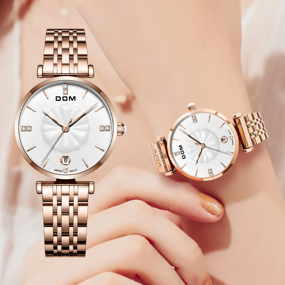 Часы DOM женские, кварцевые, водонепроницаемые, стальные, с цветком
