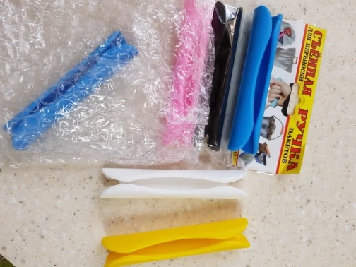 Не скажу, что товар мне понравился. Да, можно вешать несколько пакетов, но ручка тоже тонковатая, тяжёлые вещи давят на ладонь, много пакетов не повесишь, легкие вылетают из щели. Как фиксатор на открытых пакетах, тоже не зарекомендовал себя, не держится. Упакованы в пупырчатый пакет скопом, и только 2 были упакованы в индивидуальную упаковку, с названием, инструкцией. Доставка быстрая, из Тольятти около недели до Уфы.