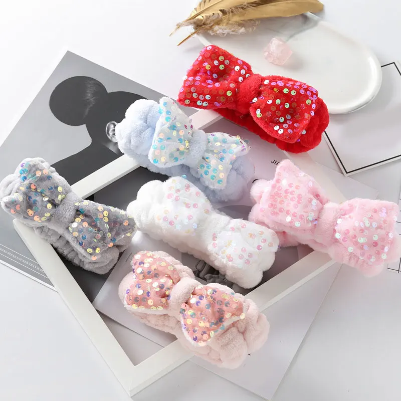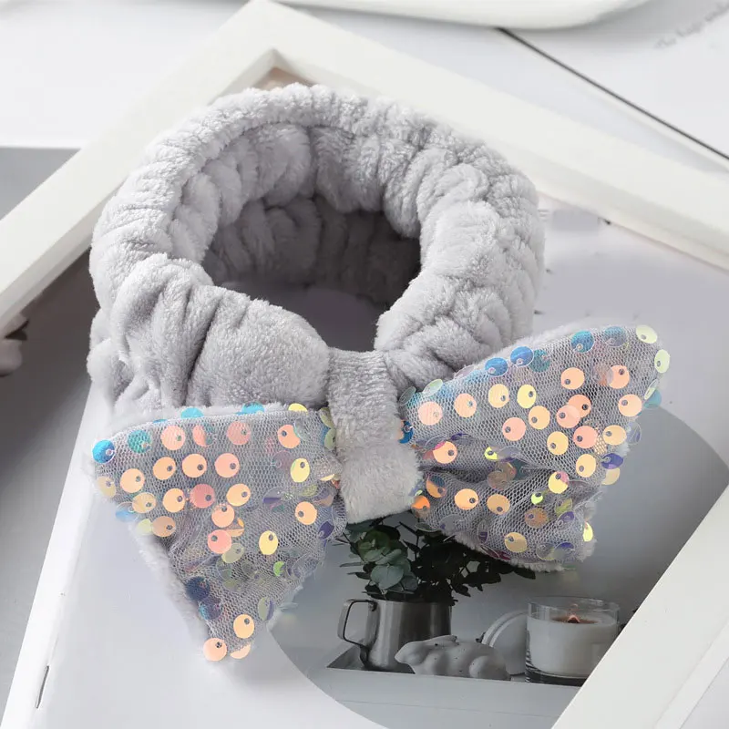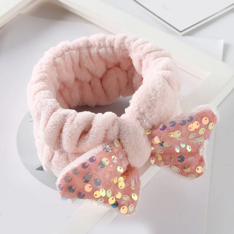 Повязка на голову женская из кораллового флиса с бантом и блестками