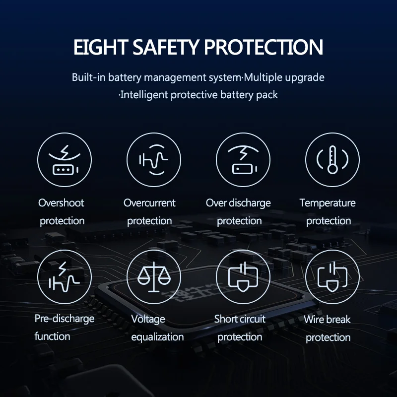 Встроенная система управления аккумулятором, несколько обновлений, интеллектуальная защита аккумуляторного блока(Защита от перезаряда, защита от перегрузки по току, защита от перенапряжения, защита от разрядки, защита от короткого замыкания, защита от перегрузки по мощности, защита от перегрузки, защита от температуры)