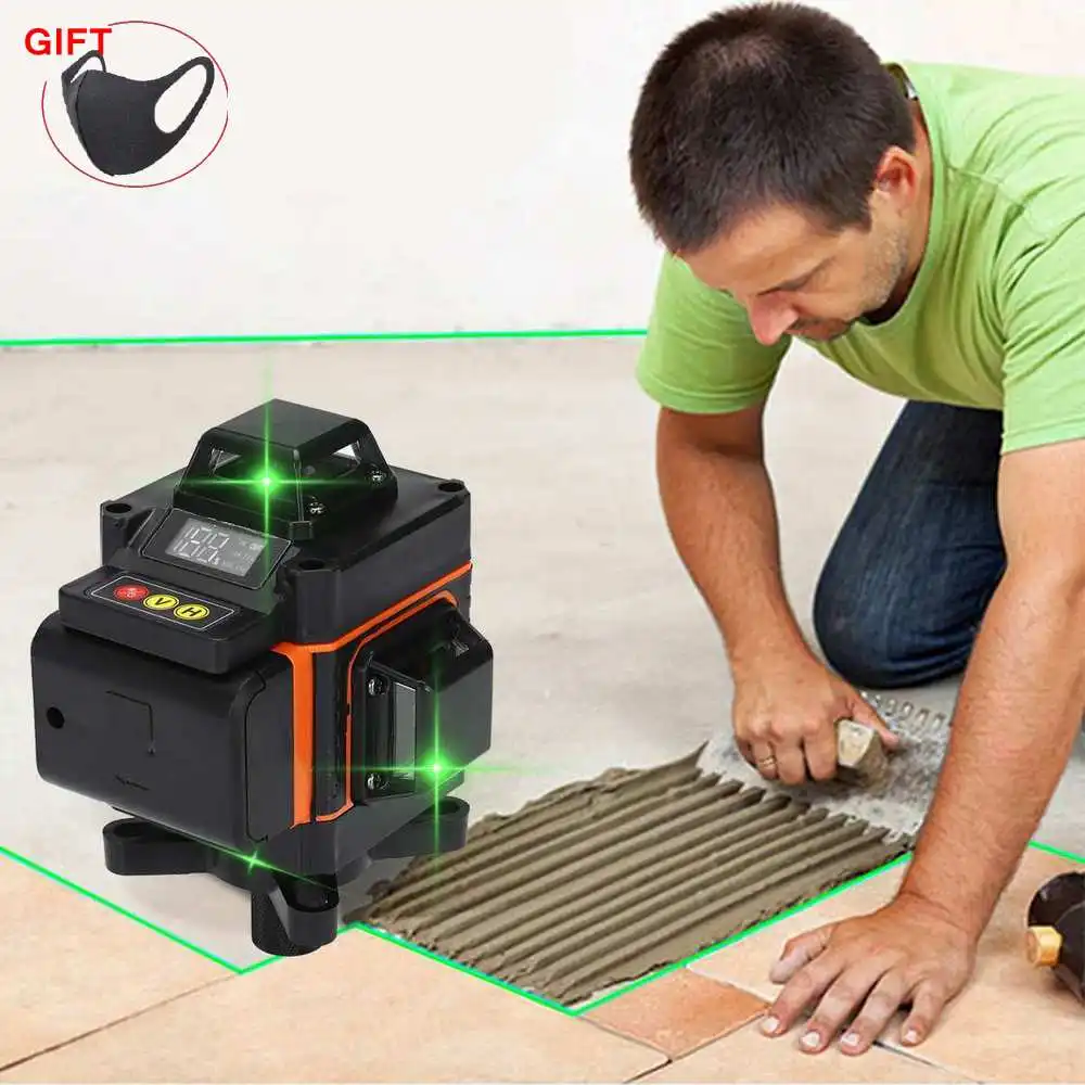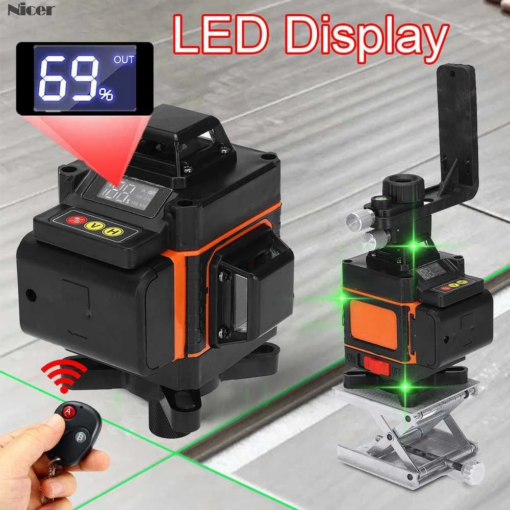 Лазерный уровень со светодиодный ным дисплеем, зеленый светильник, 12/16 линий, автоматический пульт дистанционного управления, самонивелирующийся, 360 °, поворотное измерение, горизонтальный вертикальный крест