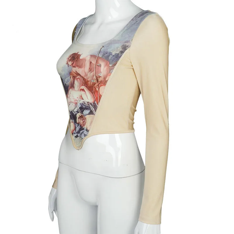 Укороченный Женский корсет с длинным рукавом и винтажным принтом