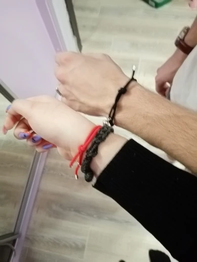 заказала в начале января. пришло аж в середине марта. розовый браслетик выглядит так, как будто его постирали с черным браслетом
