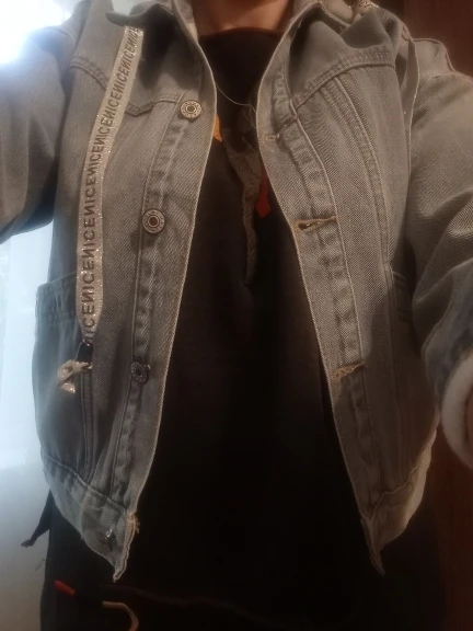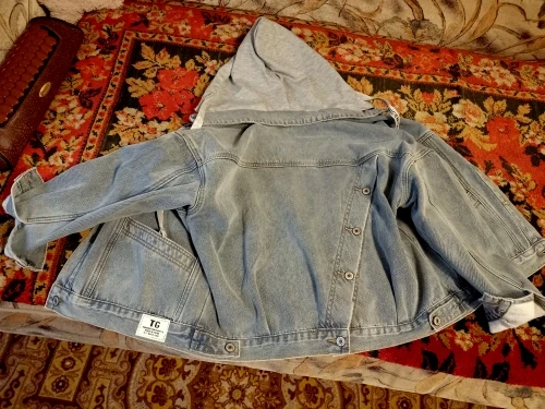 Заказанный размер подошел на русский 46, рост 170. Капюшон был в отдельном пакетике, тоненький, маленький, шнурки с люрексом. Вся куртка в блестках, джинса плотная, цвет соответствует, порадовало отсутствие запаха, внутри подкладка (типа мягкой байки, ну или как в х/б толстовках и спортивных брюках начёсик) странного сероватого цвета, причем еще и выпачканная. Короче, носить можно, но при желании можно за такие деньги купить вещь приличнее. Мне эта понравилась необычным кроем, вроде все так и есть, но она слишком мятая, чтобы оценить по достоинству в данный момент...