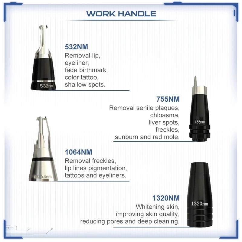 Удаление татуировок (все цвета тату, удаление век и липлаина) пигмент эпидермиса и дермы (удаление пигментированных повреждений, кофейных пятен, сениловых пластин, веснушек, пятен от солнечных ожогов и хлоазмы) лечение акне, nevus Ota, blue naevus, black nevus отбеливание кожи и удаление морщин и т. Д.