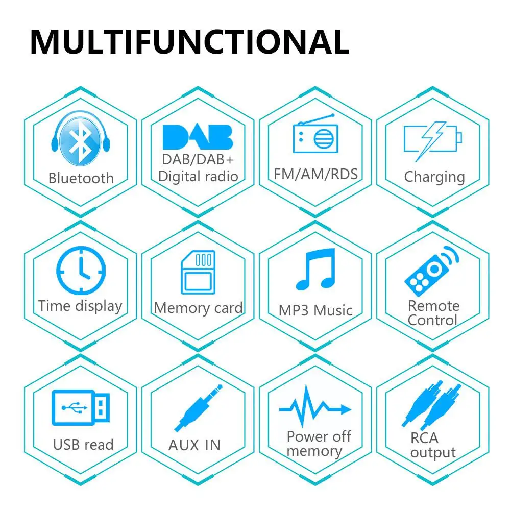 1. Один цифровой медиаприемник din (FM, AM, RDS, DAB, DAB +) поддерживает Европейское вещание высокой четкости DAB, которое полностью совместимо с DAB +, истинным цифровым сигналом. И он оснащен fm-радио/AM-высококачественным цифровым стерео. И он может искать каналы автоматически, полу-автоматически или точно.2. Этот Автомобильный стереоприемник с функцией Bluetooth имеет переменное цветовое освещение, которое может персонализировать его внешний вид и принести вам различный музыкальный опыт.3. Один din цифровой медиаприемник поддерживает чтение tf-карты USB флэш-накопитель (аудио), Bluetooth цифровой медиаприемник через возможность воспроизведения FLAC / APE / WAV / WMA / MP3 файлов, обновите аудио автомобиля с потрясающим воспроизведением звука, тем самым обеспечивая высокое качество звука для работы или путешествий.4. Один цифровой медиаприемник din оснащен Bluetooth V5.0, покрытие Bluetooth 5,0 в четыре раза больше, чем у старого Bluetooth, в два раза больше скорости и в восемь раз больше объема сообщений. Ваш один автомобильный стереоприемник DIN будет легко сопряжен. С большинством устройств Bluetooth вы можете совершать и принимать все звонки без использования рук.5. Аудиовыход RCA может быть подключен к сабвуферу.