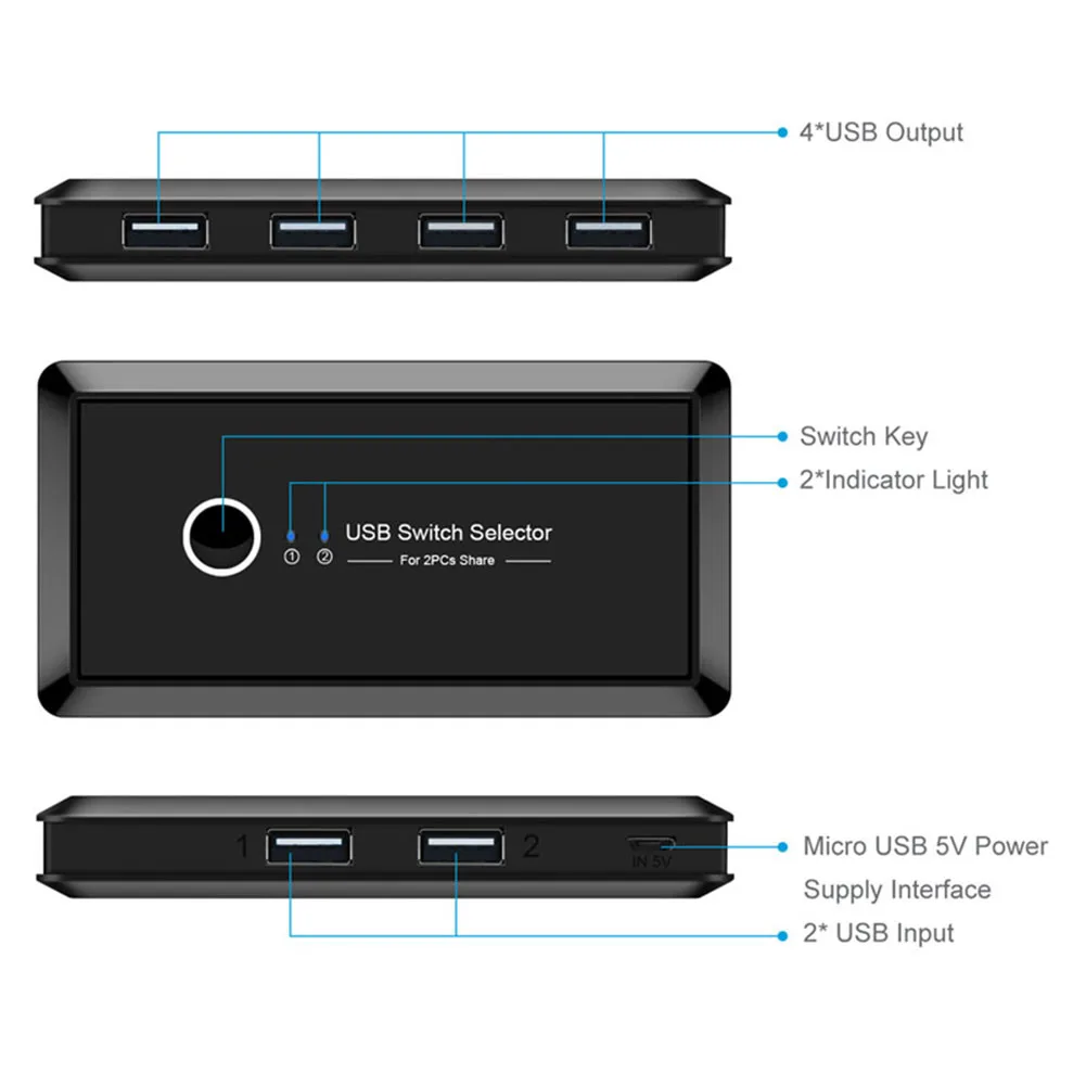 Селектор для совместного доступа 2x4 USB 2,0, 2 порта для ПК, совместное использование 4 USB-устройств для клавиатуры, мыши, принтераСпецификация:Цвет: черныйТип интерфейса: USB2.0Режим переключения: клавишаПорт питания: Micro USB 5 В (без линии питания)Размер изделия: 118x56x1 мм/4,65x2,2x0,63 дюймаВес брутто продукта: 210 гФункция: 2 компьютера совместно используют 4 USB-устройстваПоддерживаемая система: для Windows, MAC, Vista, Linux и других систем, может использоваться без установки драйверовПримечание:1. Из-за различий в мониторах светильник ВОМ эффекте фактический цвет изделия может сильно отличаться от цвета, показанного на фотографиях. Спасибо!2. Замеры сделаны вручную, поэтому возможны отклонения на 1-3 см.