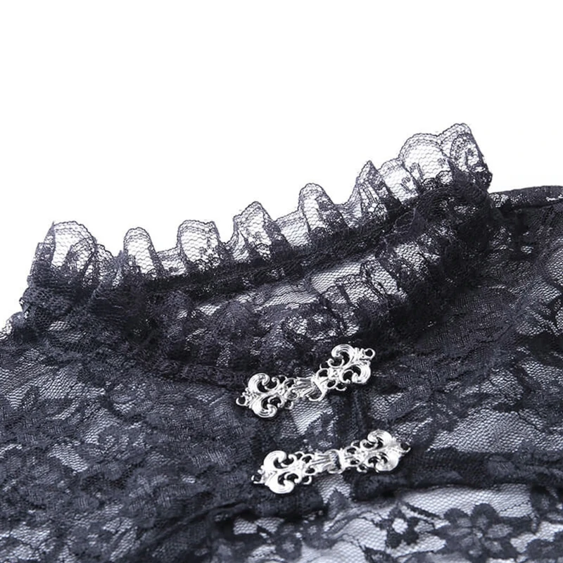 Воротник-стойка с рюшами, длинные рукава, сексуальное открытое Прозрачное цветочное кружево, однотонный черный цвет, две пряжки спереди.