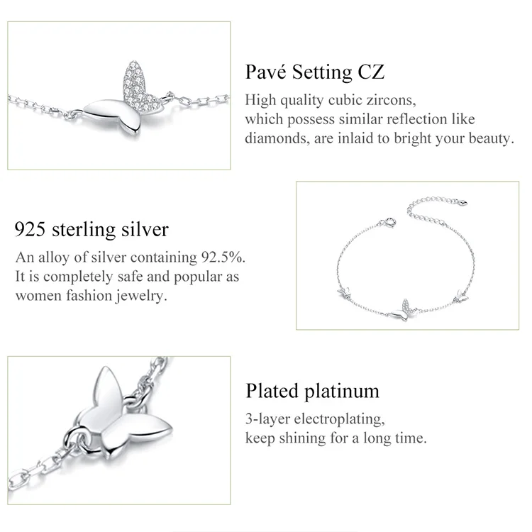Длина: 16 + 5 смS925 + Платина с покрытием + фианит CZЛетайте, как бабочка, будьте свободны в себе. Украшение из блестящего циркона добавляет ощущение моды в форму.