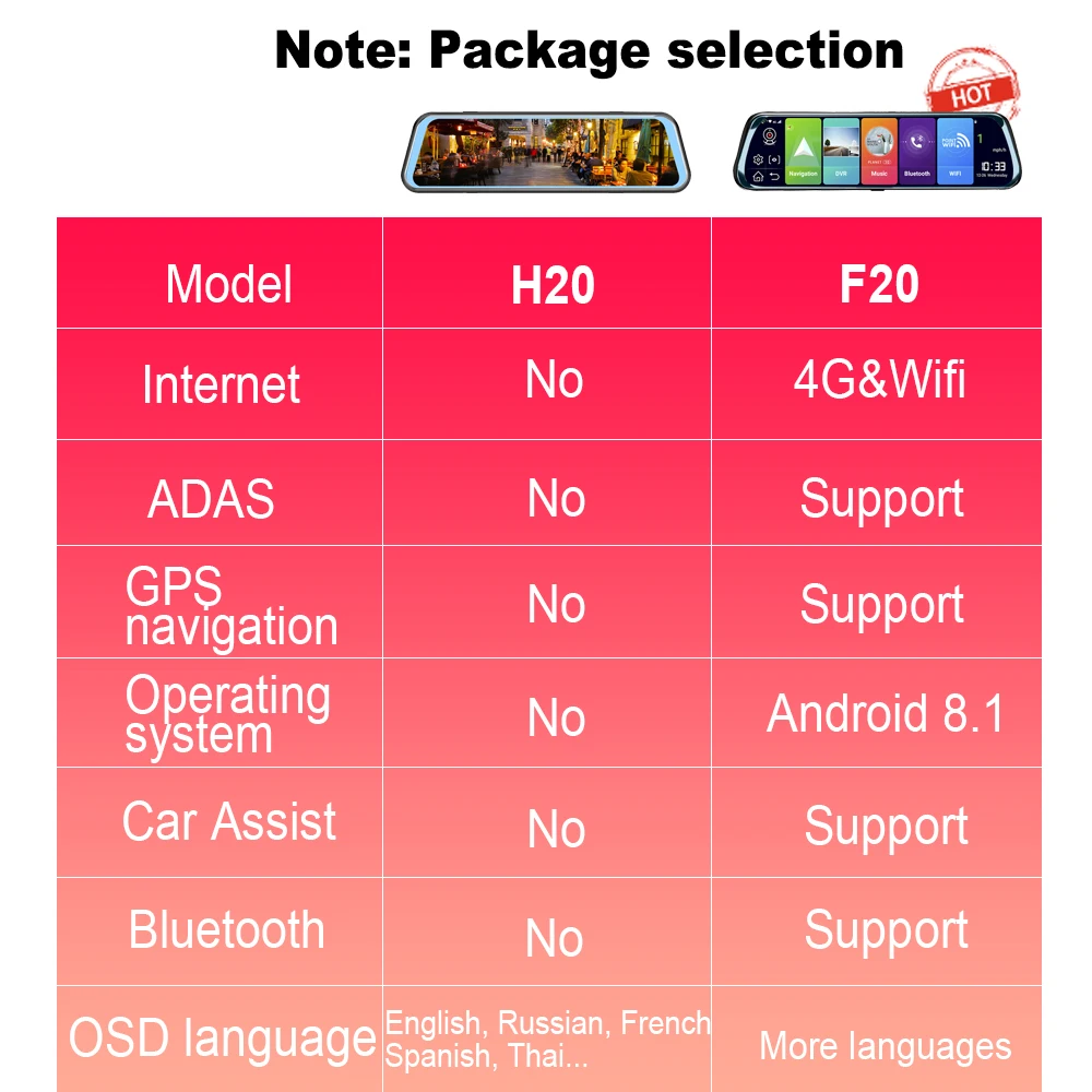 ADAS Plus ADAS делает вождение более безопасным передовыми системами сигнализации (LDWS/ FCWS/FVMA) , это полезные системы сигнализации, чтобы сохранить безопасность вашего вождения. Функция Bluetooth Hands-free благодаря bluetooth hands-free, После сопряжения bluetooth между видеорегистратором и смартфоном, вы можете совершать и принимать звонки непосредственно с самого зеркального видеорегистратора со встроенным микрофоном и динамиком. Функция передачи FM вы любите слушать музыку во время вождения? Благодаря функции fm-передачи, вы можете легко синхронизировать зеркальную dvr музыку с вашим автомобильным аудио.Стандартная посылка F20:1 x Android GPS зеркало DVR 1 x задняя камера 1 x Задний кабель 1 x GPS антенна 1 x Автомобильное зарядное устройствоСтандартная посылка H20:Зеркальный видеорегистратор-1 шт. задняя камера-1 шт. задний кабель-1 шт. автомобильное зарядное устройство-1 шт.