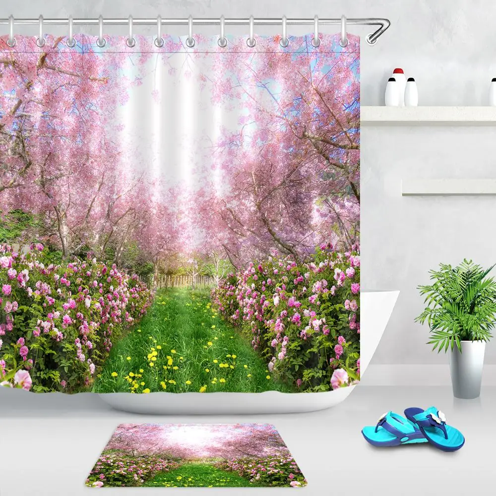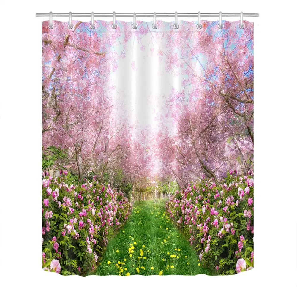 Весенний сад Душ Шторы s вишня в цвету цветок Цветущий Луг Ванна Шторы износостойкая ткань из полиэстера Ванная комната Шторы s, украшенное мозаикой из драгоценных камней, 12 крючков