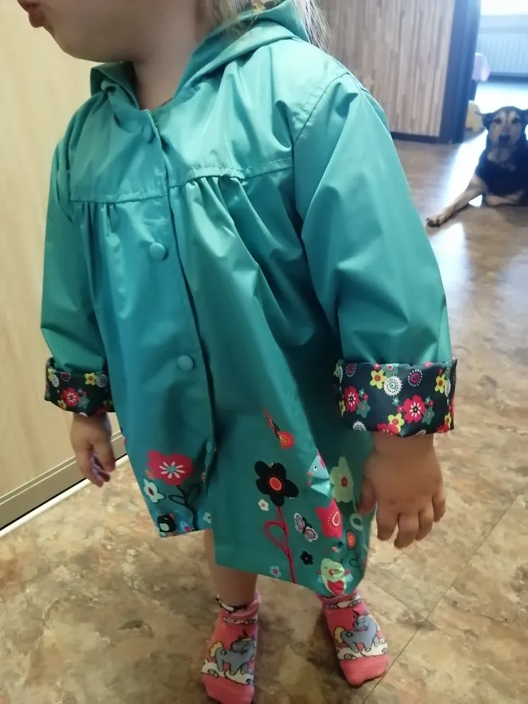 Красивый водонепроницаемый. Цвет хороший (бирюзовый синий) Маленькие цветы хорошо держались при первой стирке. Чтобы увидеть в дополнение! Размер правильно, рукава могут быть немного широкими. Но по цене