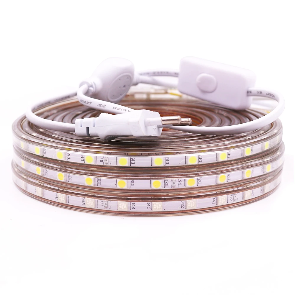 SMD 5050 AC220V Светодиодная лента гибкий светильник 60 светодиодовм водонепроницаемая светодиодная лента 1 м2 м3 м5 м6 м8 м9 м10 м15 м20 м светодиодный светильник с вилкой