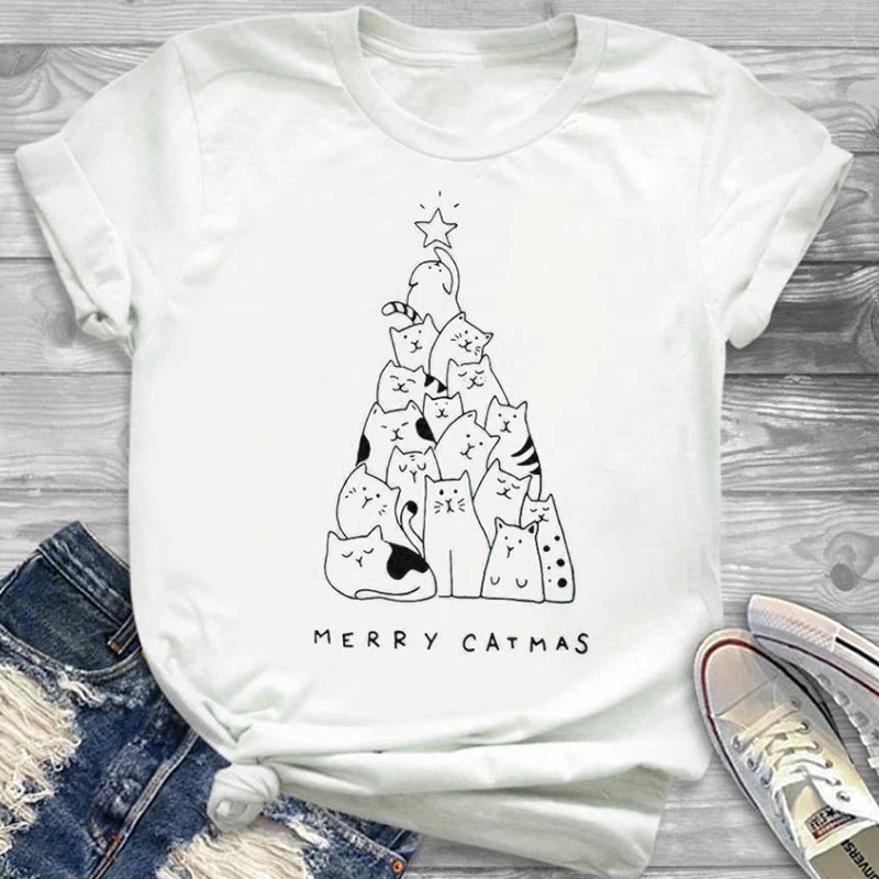 Женская хлопковая футболка с коротким рукавом и надписью Merry Christmas, футболка с котами из мультфильмов