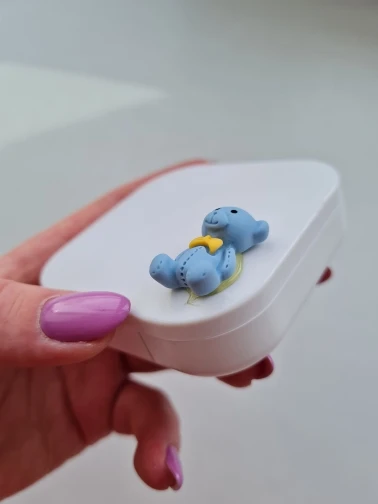 Очень довольна заказом и быстрой доставкой (около двух недель), но расстроена, что контейнер приехал с отвалившимся динозавром. Я заказала этот контейнер именно из-за него, и было неприятно видеть, что он отпал - неважно, из-за низкого качества клея или неаккуратной перевозки. Пришлось приклеивать обратно, но вышло не так аккуратно, как могло бы быть, останься он на законном месте. В остальном контейнер хороший. Подходит для обычных линз, склеральные не влезут, но мне и не критично. В комплекте емкость для жидкости, пинцет и присоска.