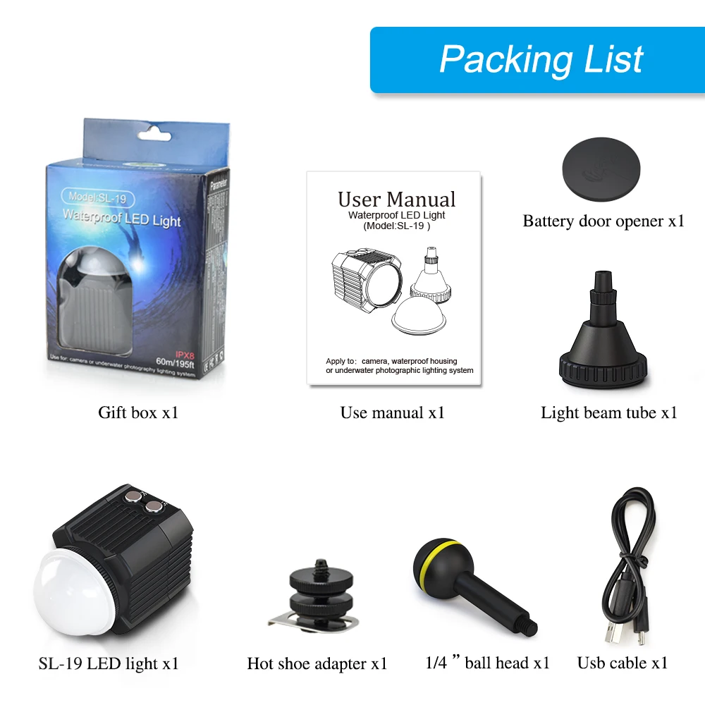 Совместимый бренд камеры: мобильный телефон, бренд SONY,Fujifilm,Mamiya,NIKON,Leica,Gopro,Sigma,Canon,Pentax,yi,Olympus,HASSELBLAD,Samsung,Lumix Номер модели: SL-19 Дисплей: нет Материал: PC110 + алюминиевый сплав Цвет: черный Источник света: белый светильник Размер (шxвxд): 6,9*4,55*4,5 см Цветовая температура: 6500K Источник питания: перезаряжаемая литиевая батарея TTL: нет Вес: 114 г Особенности 1. Этот продукт-новейший Разработанный светодиодный водонепроницаемый светильник с простым и элегантным внешним видом. Максимальная глубина погружения до 60 метров и подходит для различных сред. 2. Он изготовлен из высокояркого светодиодный патч, который поможет вам снимать яркие фотографии. 3. Корпус изготовлен из синтетического материала и алюминиевого сплава, который имеет сильное сопротивление для защиты встроенных лампочек от падения, нагрева и аварии. Параметры Яркость: сильный светильник 2000LM; Низкий светильник 600LM; SOS 700LM; Синий светильник/красный светильник 1W Аккумулятор: литий-ионный Аккумулятор 7,4 В/110 мАч Вход для зарядки: Mcro USB 2,0 порт, DC 5V/1A Глубина водонепроницаемости: 60 м/195фт Светодиодный срок службы: 50000 часов Угол облучения: 120 градусов Светильник управления Нажмите кнопку S1 для цикла, кольцевой светильник включится в сильный светильник-низкий светильник-SOS-off (четыре уровня). Красный/синий светильник Нажмите кнопку S2 для цикла. Кольцевой светильник включится в красный светильник-синий светильник-выключен (три уровня). Предостережение Не направляйте светильник на человеческий глаз, чтобы не повредить зрение. Посылка: 1 * Светодиодный светильник (с диффузором) 1 * балочная трубка 1 * адаптер 1 * шаровая Головка 1 * USB кабель 1 * открывалка для аккумулятора Только вышеуказанная посылка, другие товары не включены. Примечание: светильник и различные дисплеи могут привести к тому, что цвет товара на картинке немного отличается от реального. Допускается погрешность в измерениях +/- 1-3 см.