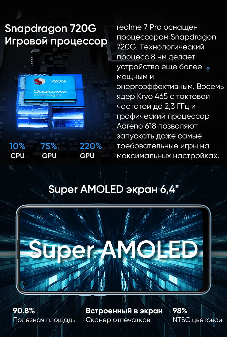 Смартфон 2020 realme 7 Pro Sony IMX682 Квадрокамера 64 Мп, Super AMOLED экран 6.4", Селфи-камера 32 Мп в экране Molnia