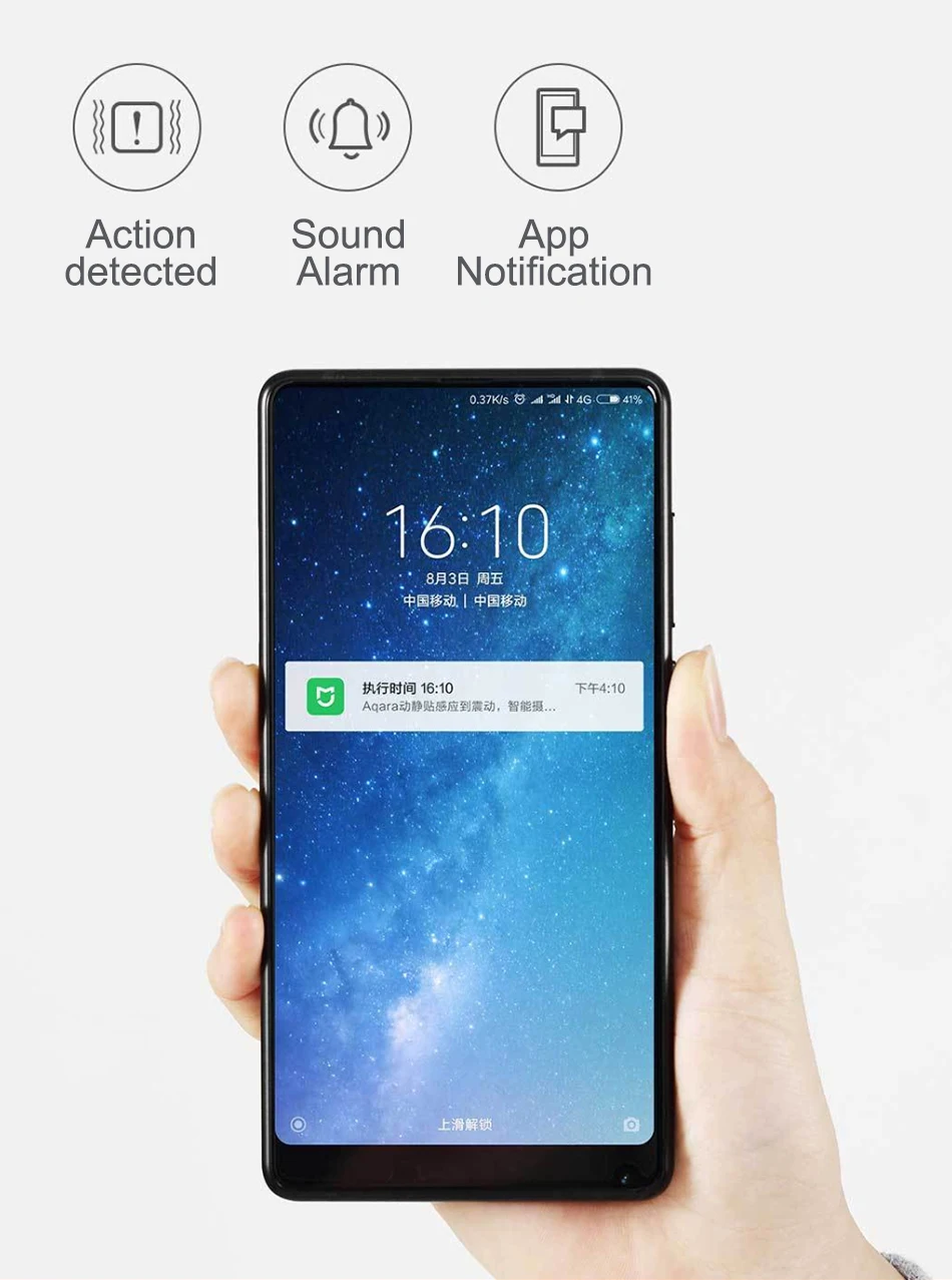 При обнаружении вибрации, наклона или падения датчик вибрации Aqara запустит концентратор, чтобы вызвать сигнал тревоги и Отправить уведомление на ваш телефон.