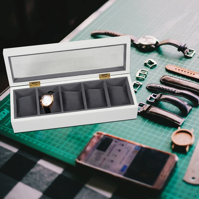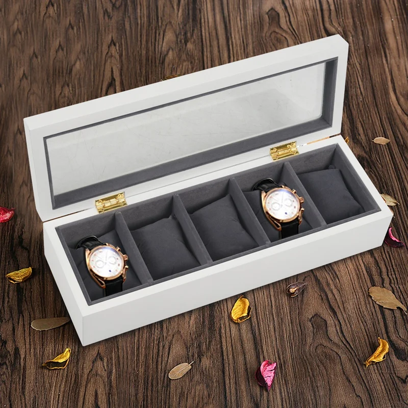 Белая деревянная коробка для часов с 5 слотами, черная фланелевая Маленькая подушка, демонстрационная коробка для хранения часов