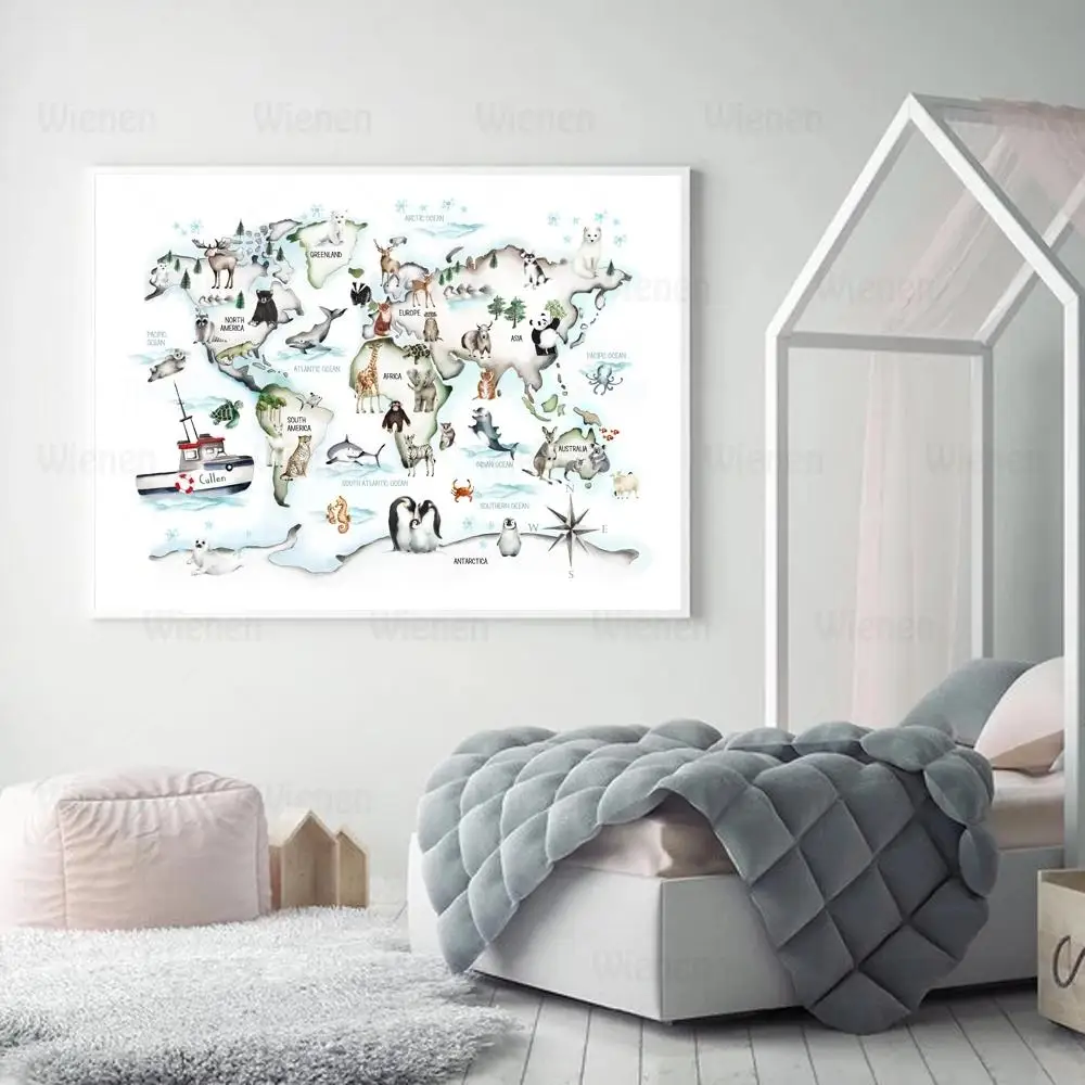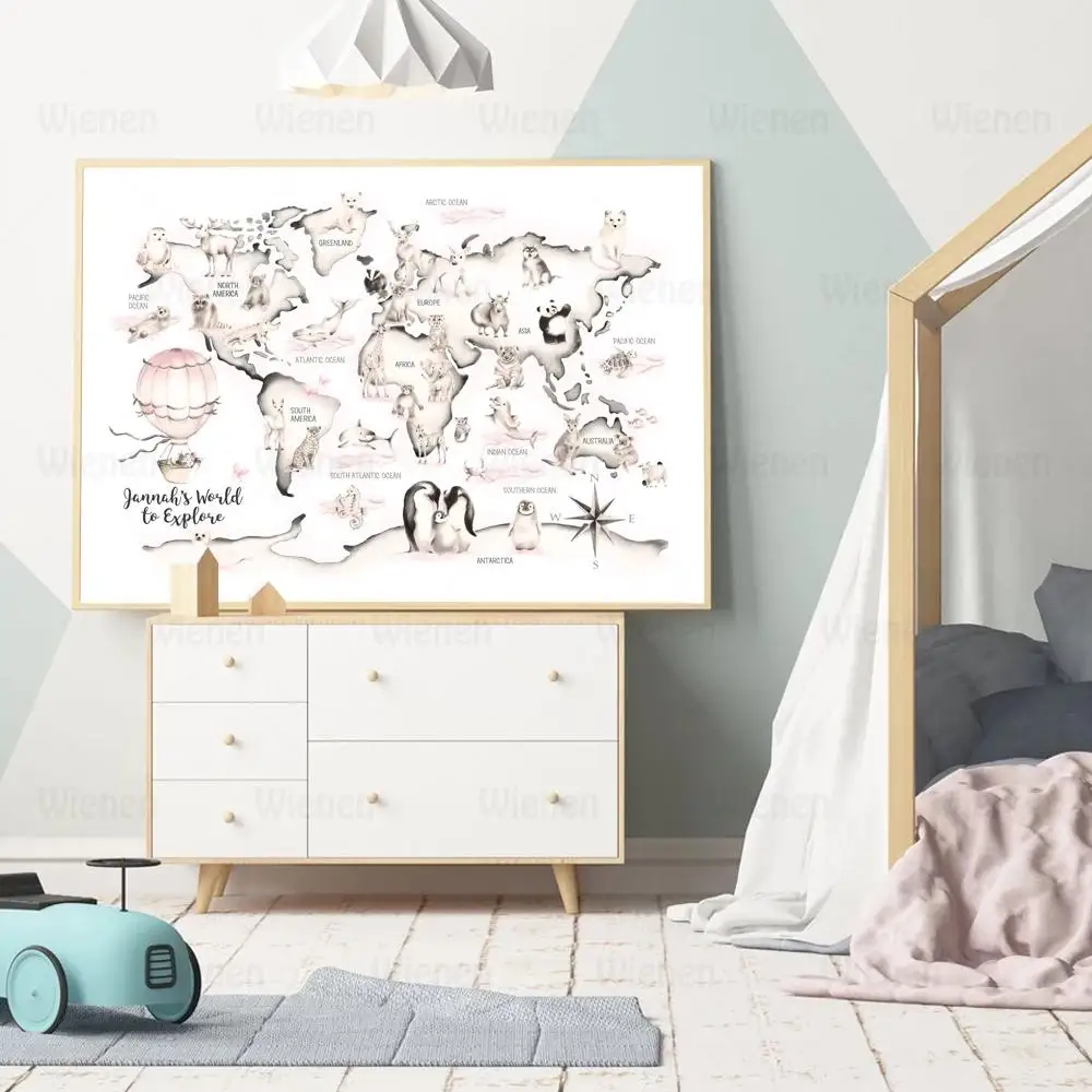 Настенный художественный постер для детской комнаты, Карта мира с лесными животными, Картина на холсте, детская Акварельная карта, картина с пользовательским именем без славы