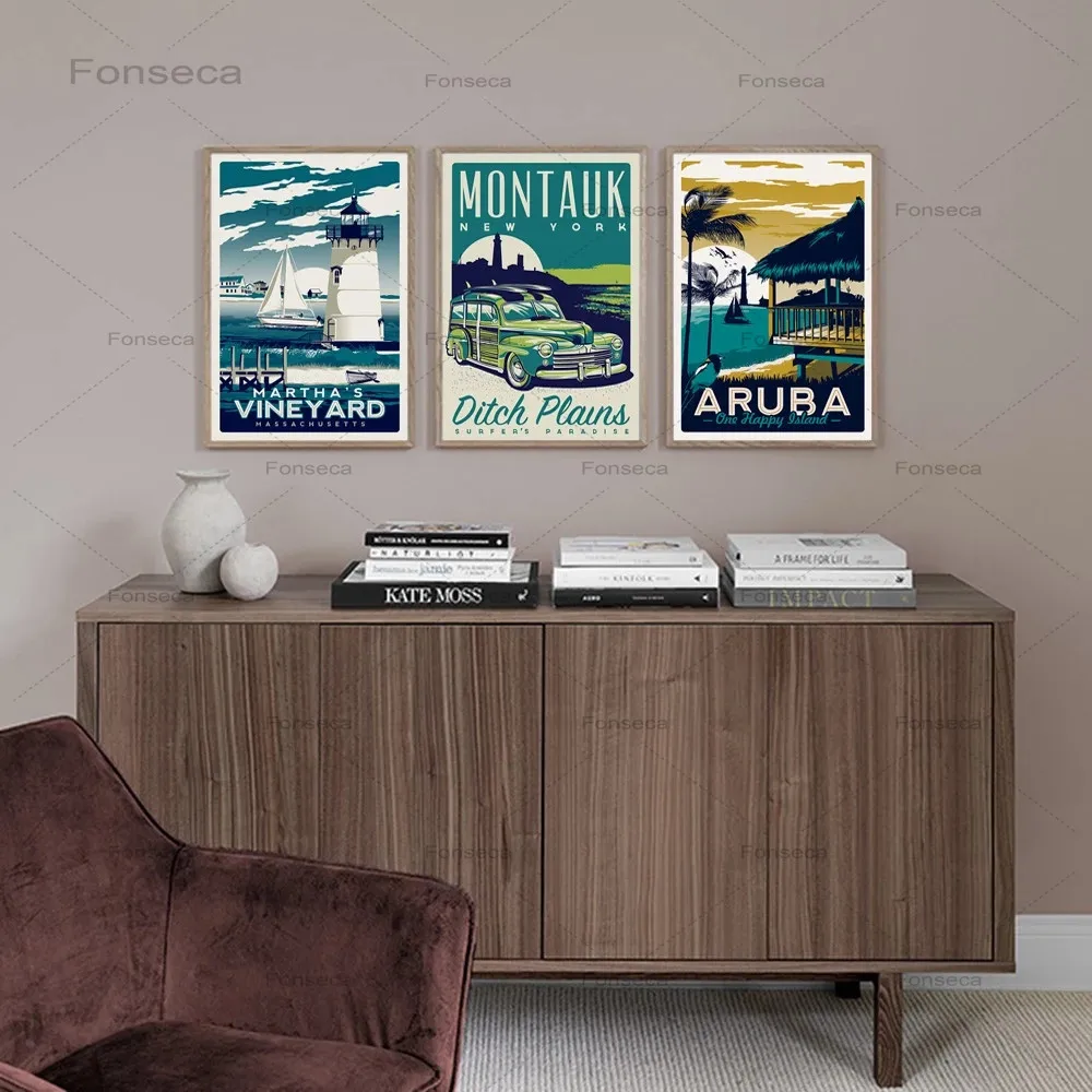 Мультяшный пейзаж, Постер в скандинавском стиле, Нью-Йорк, Сан-Франциско, Аруба, морской автомобиль, Настенная картина на холсте, Настенная картина для декора гостиной