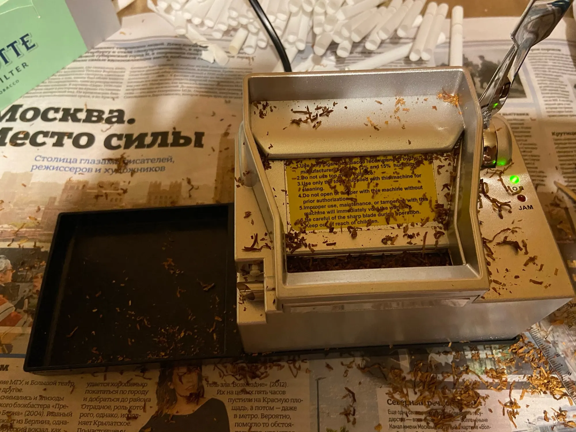 Машинка хорошая. Забил около 100 сигарет. Не добивает до фильтра стандартные гильзы, но наверное нужно наловчиться.
