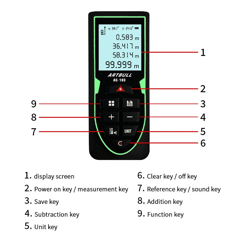 Нормальный дальномер. Углы по осям и расстояние конечно же показывает с небольшой погрешностью, но для бытового прибора все в пределах нормы. Зеленый лазер видно лучше красного. Доставка быстрая.