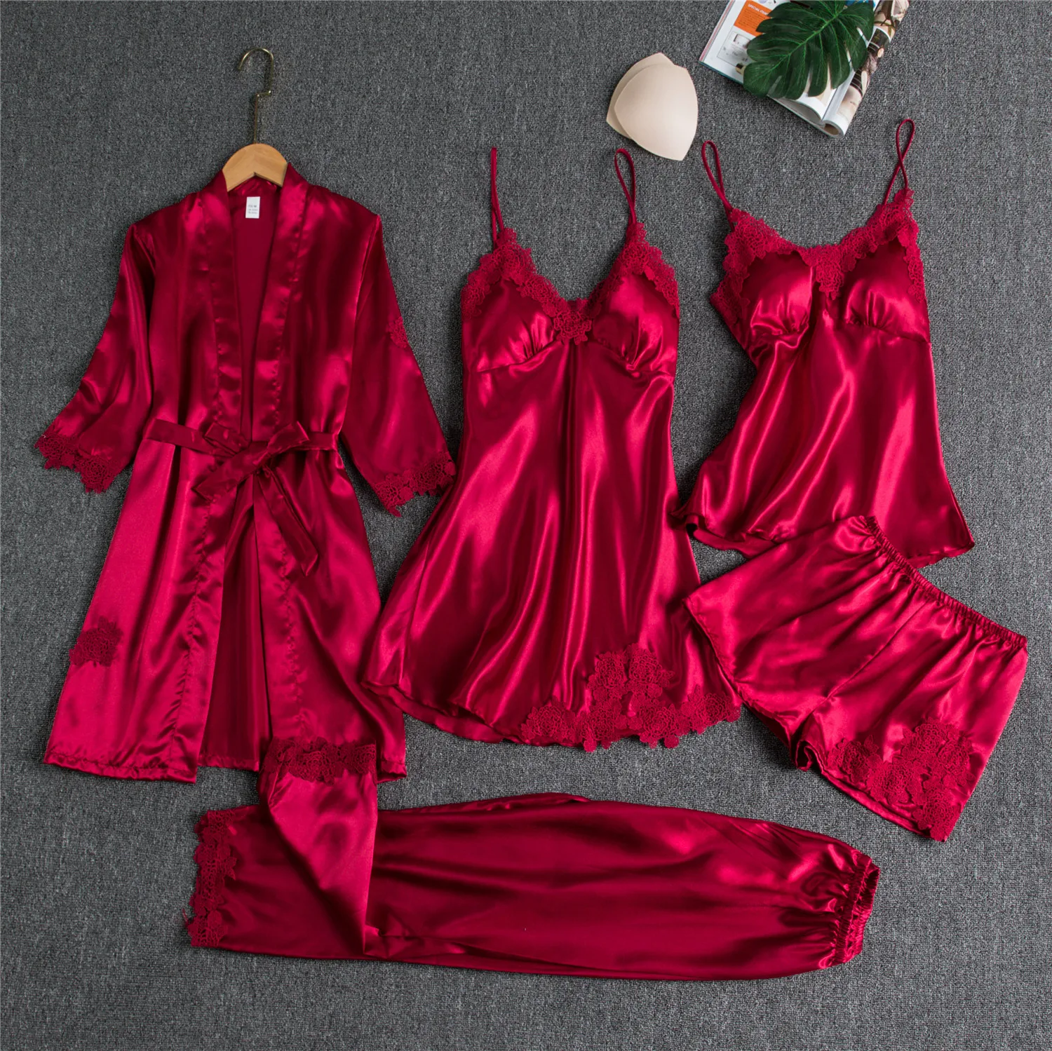 Сексуальная ночная рубашка, атласная пижама, кимоно, халат, платье, 5 шт., комплект для сна, женский кружевной Пижамный костюм, ночное белье, свободное интимное белье