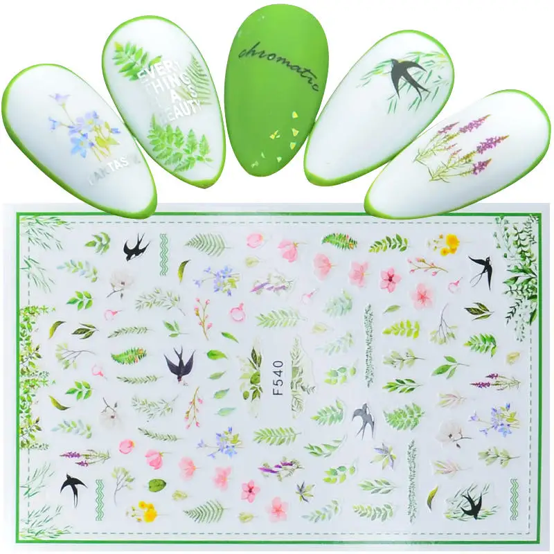 Наклейки для ногтей с зеленым листом и ласточкой, наклейки для мани...