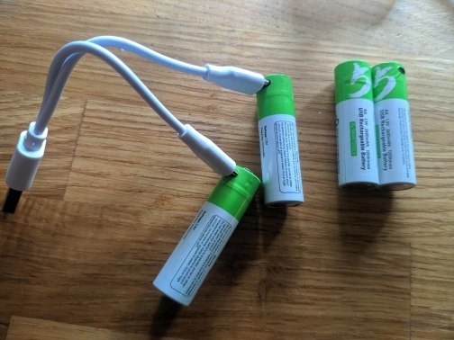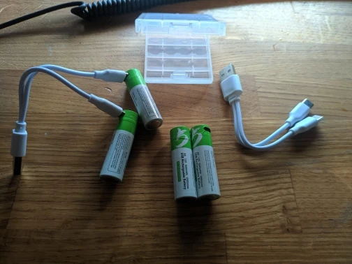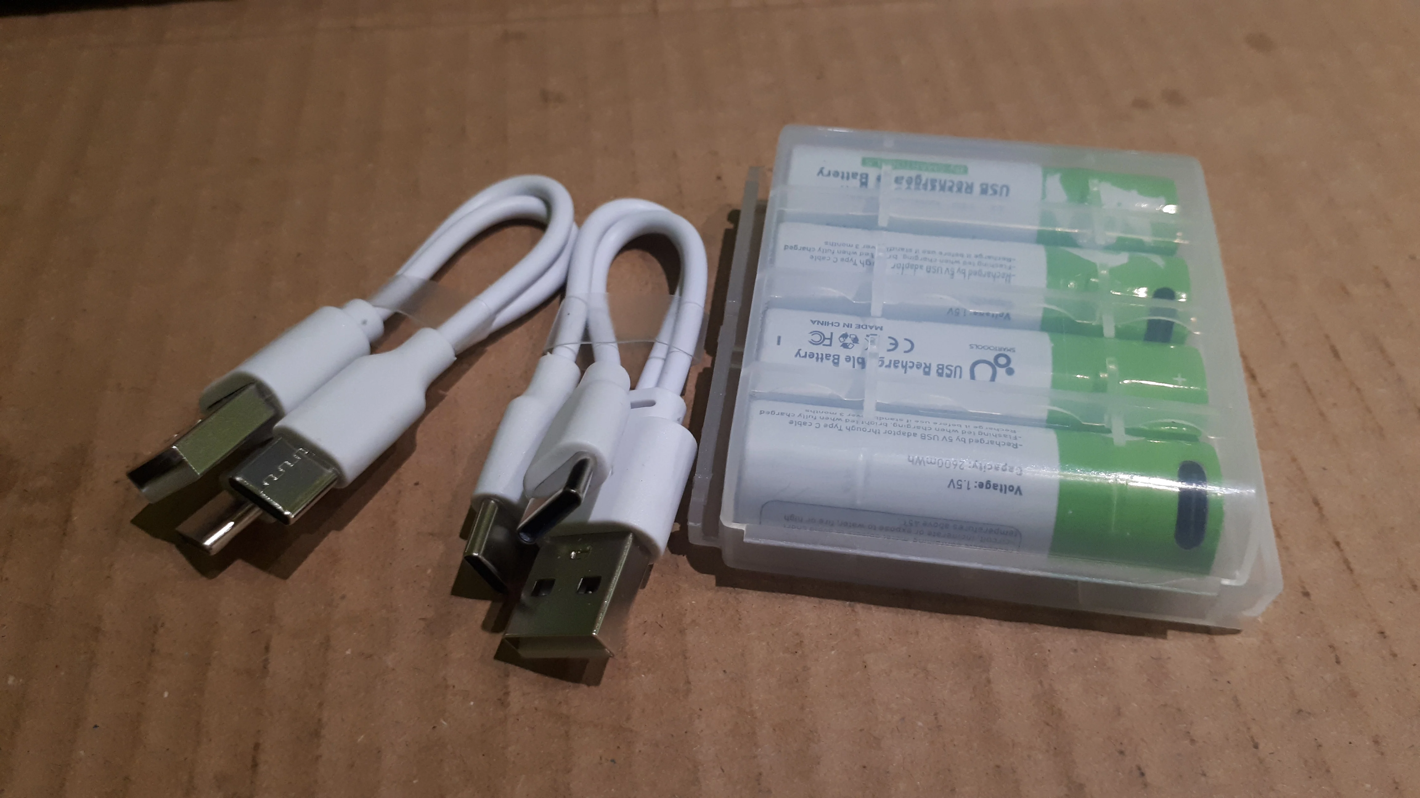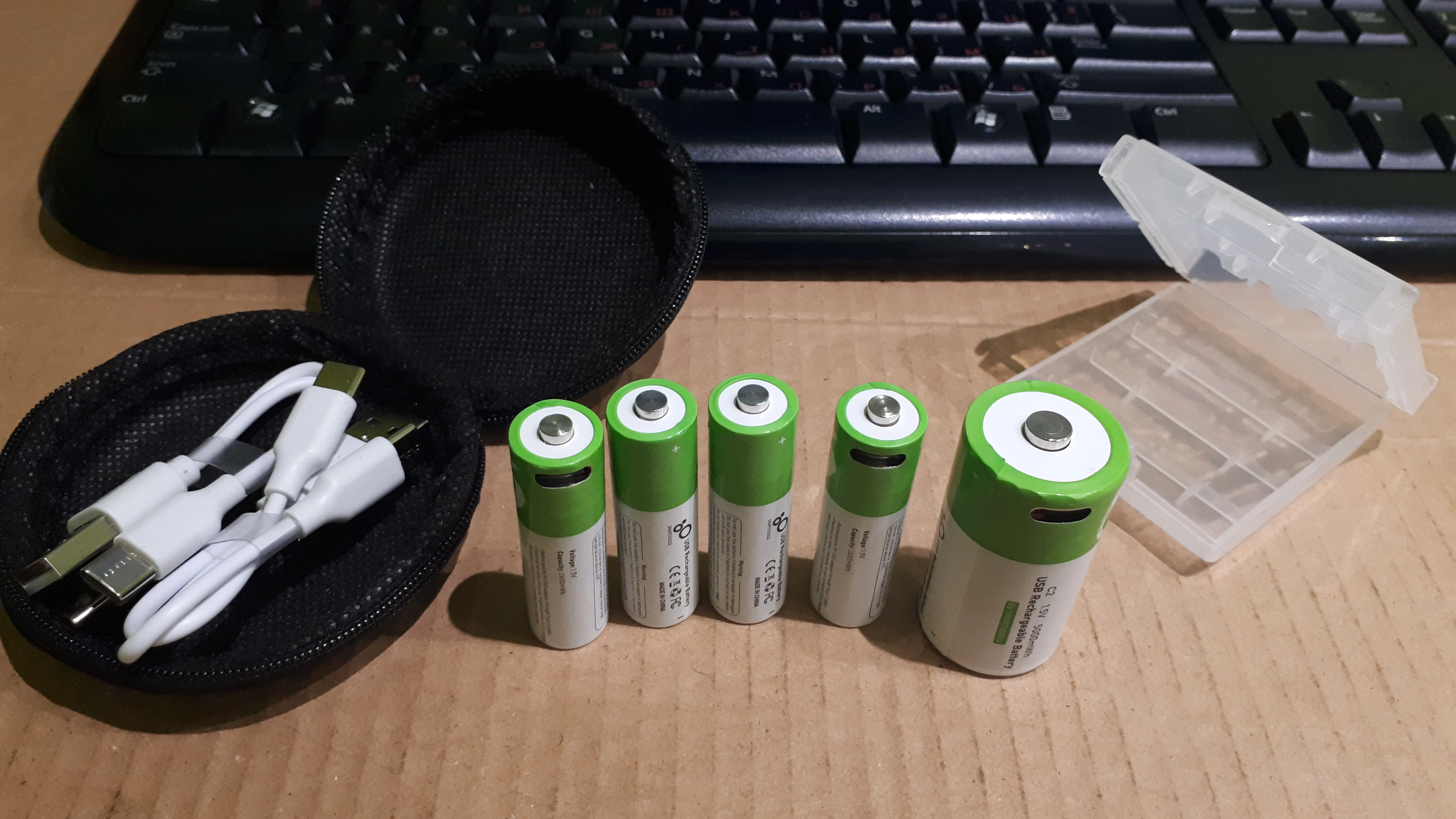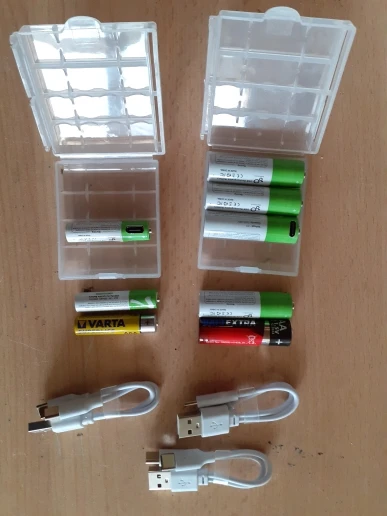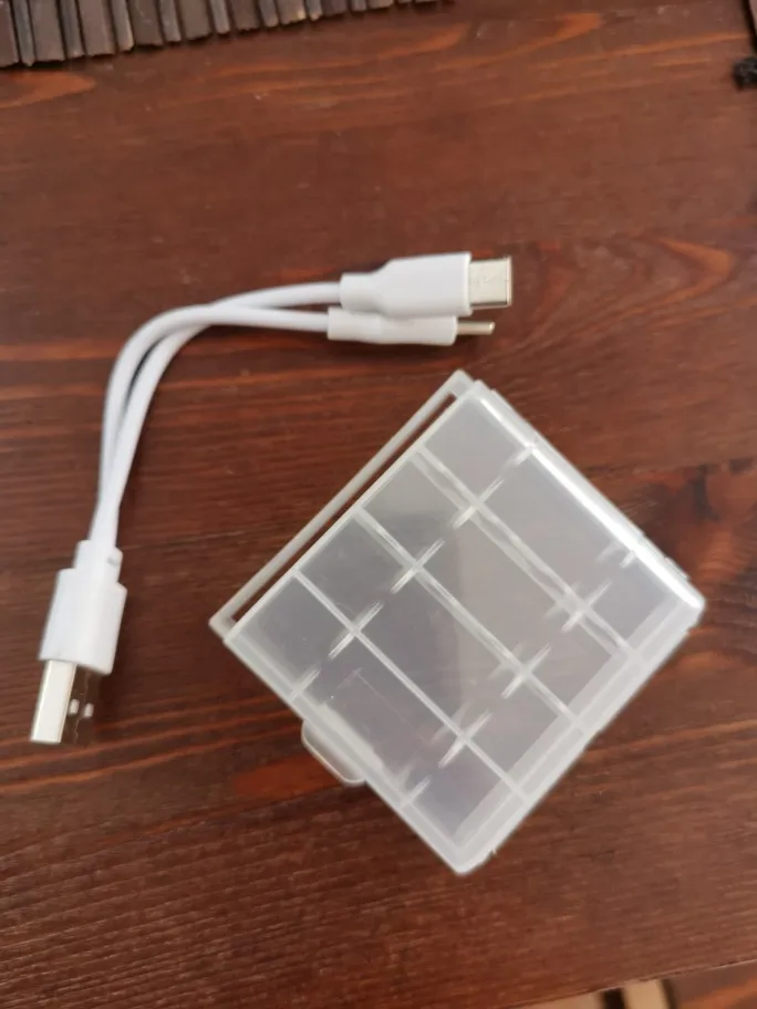 Получил второй пакет. 4 батарейки AA и 2 USB-C кабеля для зарядки. Я протестировал USB-C кабель и зарядку pinout является стандартным, поэтому я смог зарядить с ним 2 смартфона. Универсальный, очень хороший! Первый пакет с клавиатурой в течение 14 дней, и он все еще работает хорошо. Это намного лучше, чем NiMH bateries. Хороший продавец!