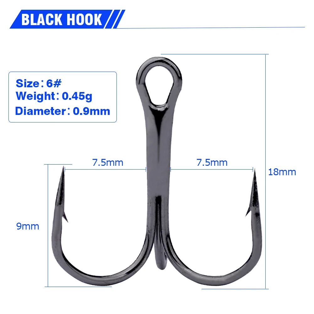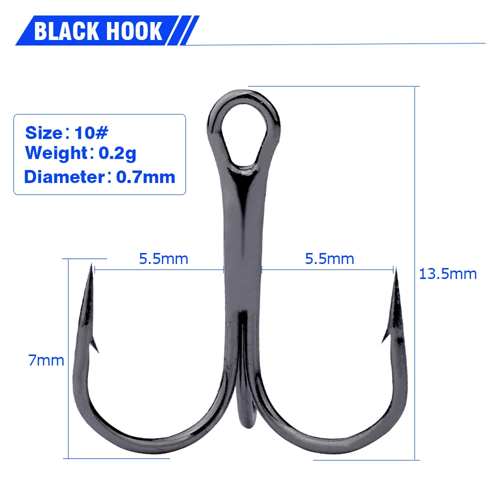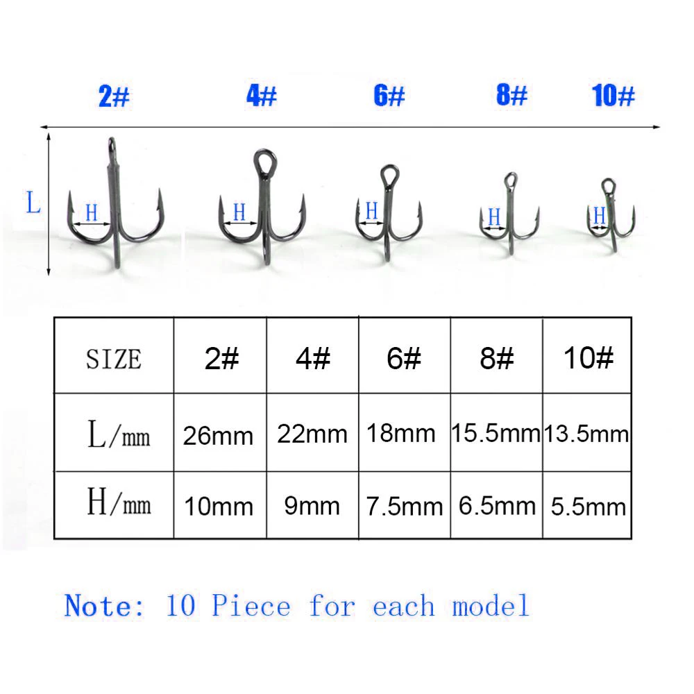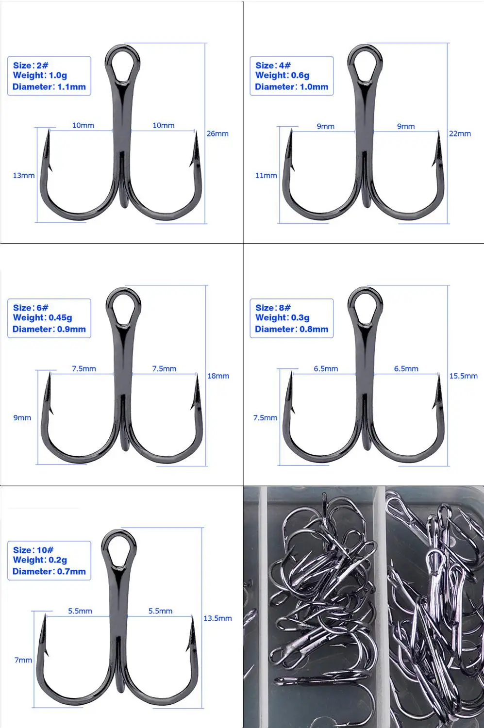 50 тройных крючков и коробка, каждого размера по 10 штук.