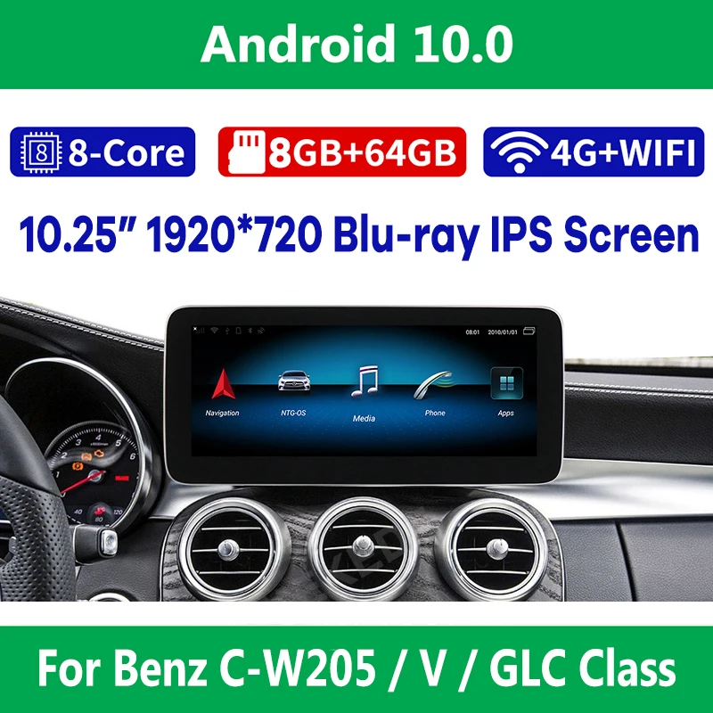Автомобильная Мультимедийная система, плеер на Android 10, с восьмиядерным процессором, 10,25 дюйма, GPS, 8 ГБ ОЗУ, для Mercedes Benz C Class W205, GLC-Class X253, V-Class W446