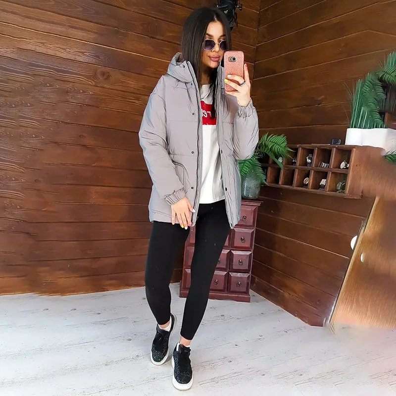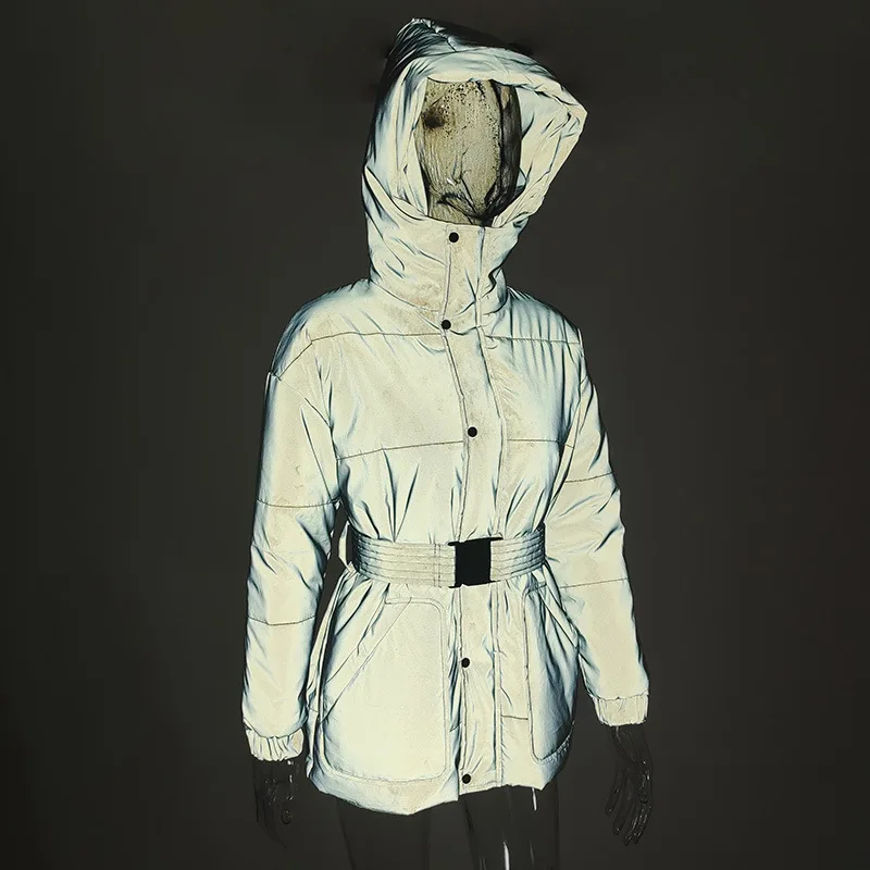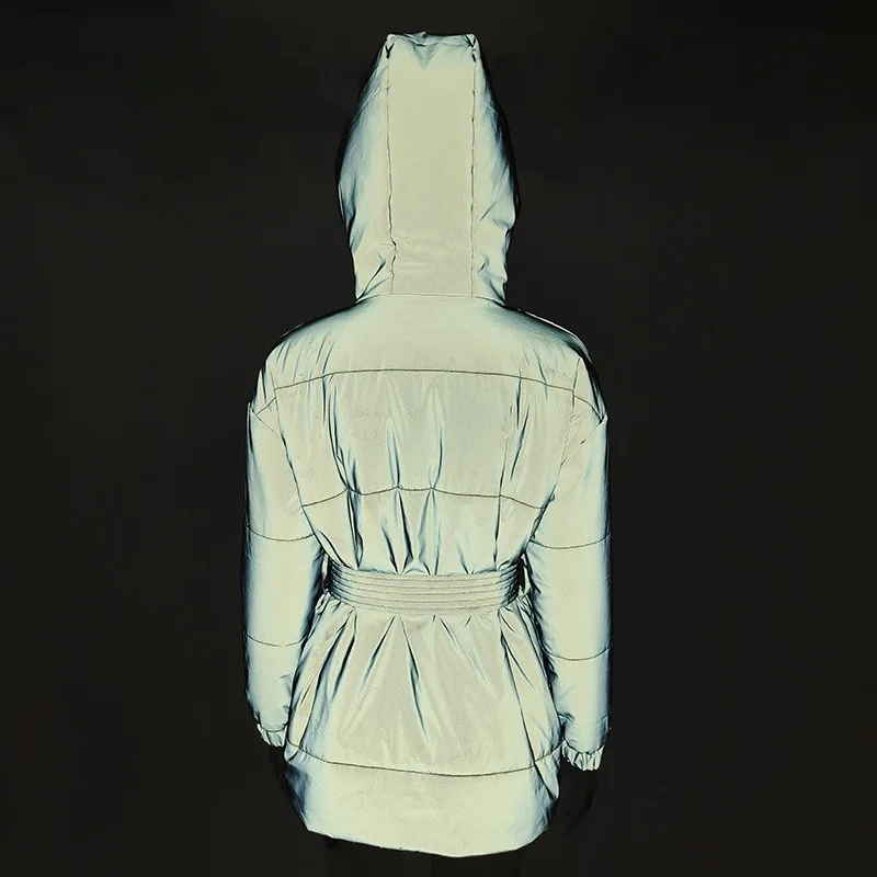 Новинка 2020, светоотражающая куртка с капюшоном и поясом, женская зимняя модная теплая парка на молнии с длинным рукавом, хлопковые пальто, флуоресцентная одежда