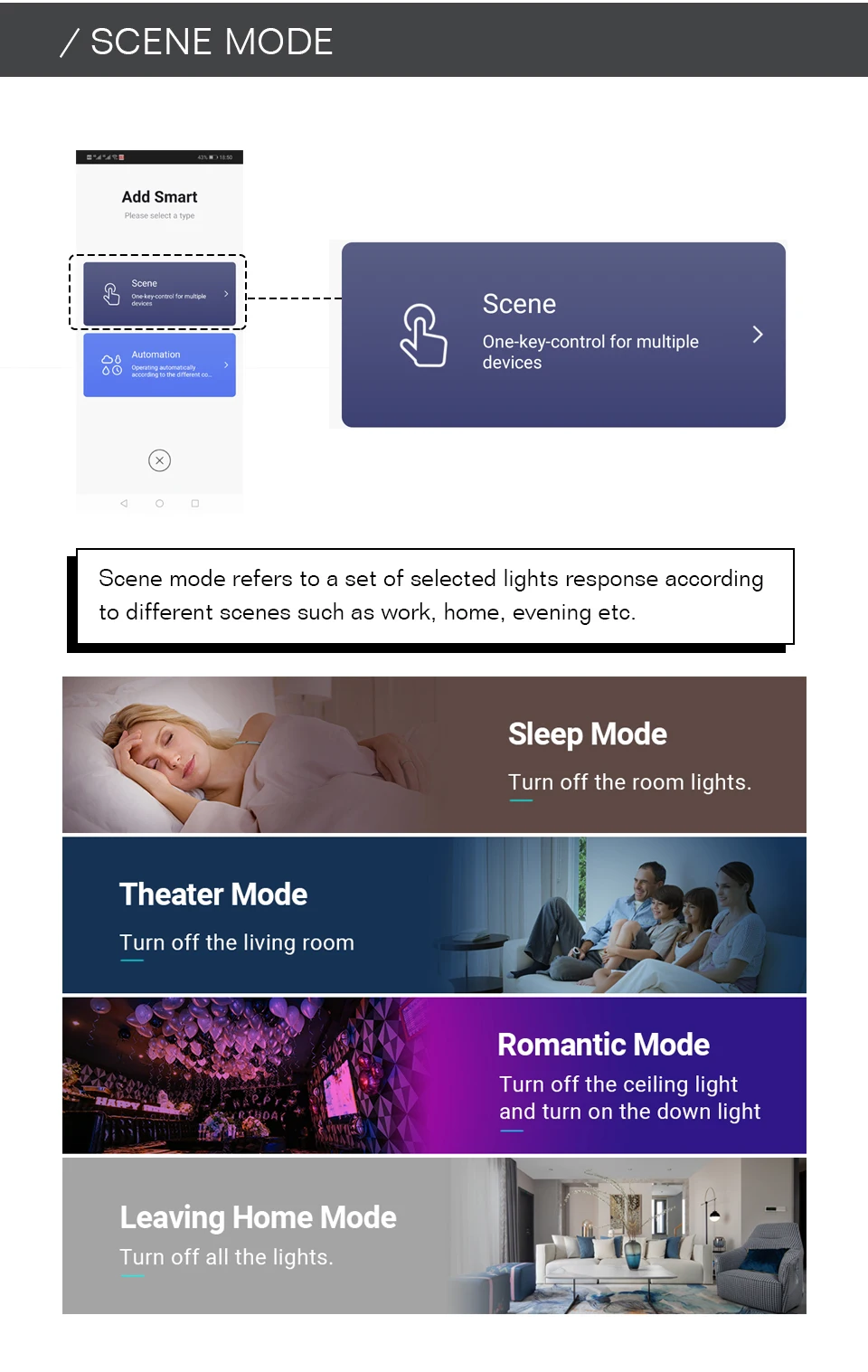 Установите датчик окна двери на дверь и сотрудничайте с переключателем Zigbee, чтобы установить связь сцены. Когда вы вернетесь домой и откроете дверь светильник автоматически включится.