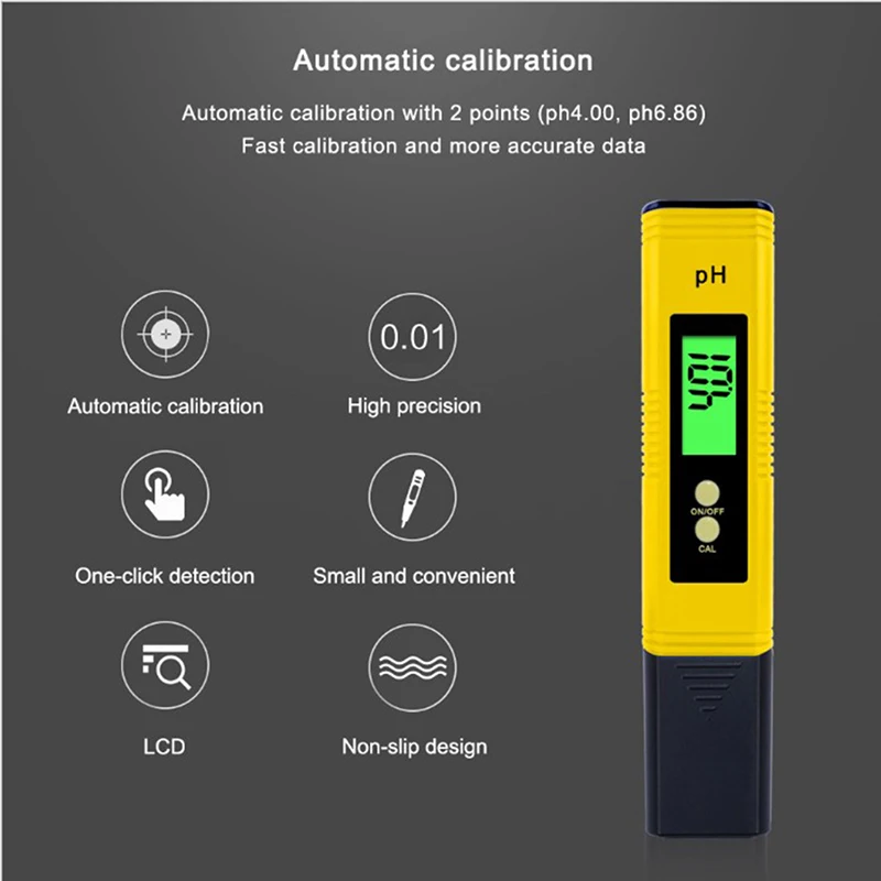 Характеристики:Материал: пластикЦвет: как на картинкеДисплей: цифровой ЖК-дисплейТочность: 0,01Разрешение: 0,01Рабочая температура: 0 ~ 60 °CДиапазон измерения: 0,00 ~ 14,00Тип зонда: прецизионная стеклянная лампочка электродаИсточник питания: 2*1,5 В LR44 батареи
