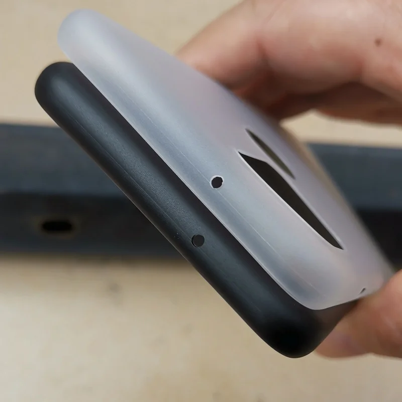 очень тонкий- как и хотел! супер! в нем телефон как без чехла, но от царапин защищен и есть маленький защищающий бортик над камерой.