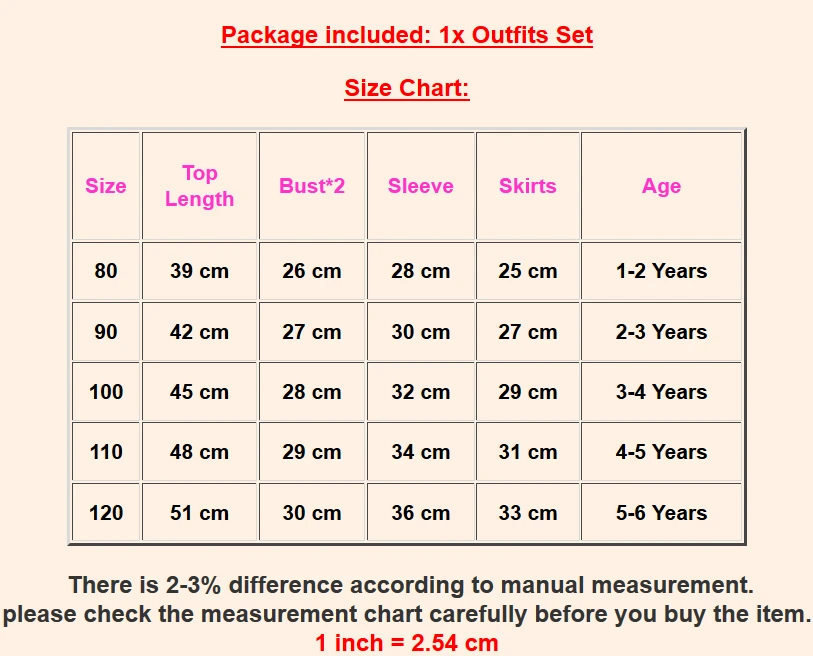 Размеры Длина топа Грудь Длина рукава Юбки Возрастной Совет 80 39 См 26*2 см 28 см 25 см Для детей от 1 до 2 лет 90 42 см 27*2 см 30 см 27 см От 2 до 3 лет 100 45 см 28*2 см 32 см 29 см 3-4Годы 110 48 см 19*2 см 34 см 31 см 4-5Годы 120 51 см 30*2 см 36 см 33 см 5-6ГодыИз-за ручных измерений возможна погрешность в 2-3%.Прежде чем купить эту товарную позицию, просим тщательно свериться с таблицей размеров. 1 дюйм = 2,54 смОбратите внимание что небольшая разница в цвете считается приемлемой. Это может быть связано с положением источника света и с настройками экрана.
