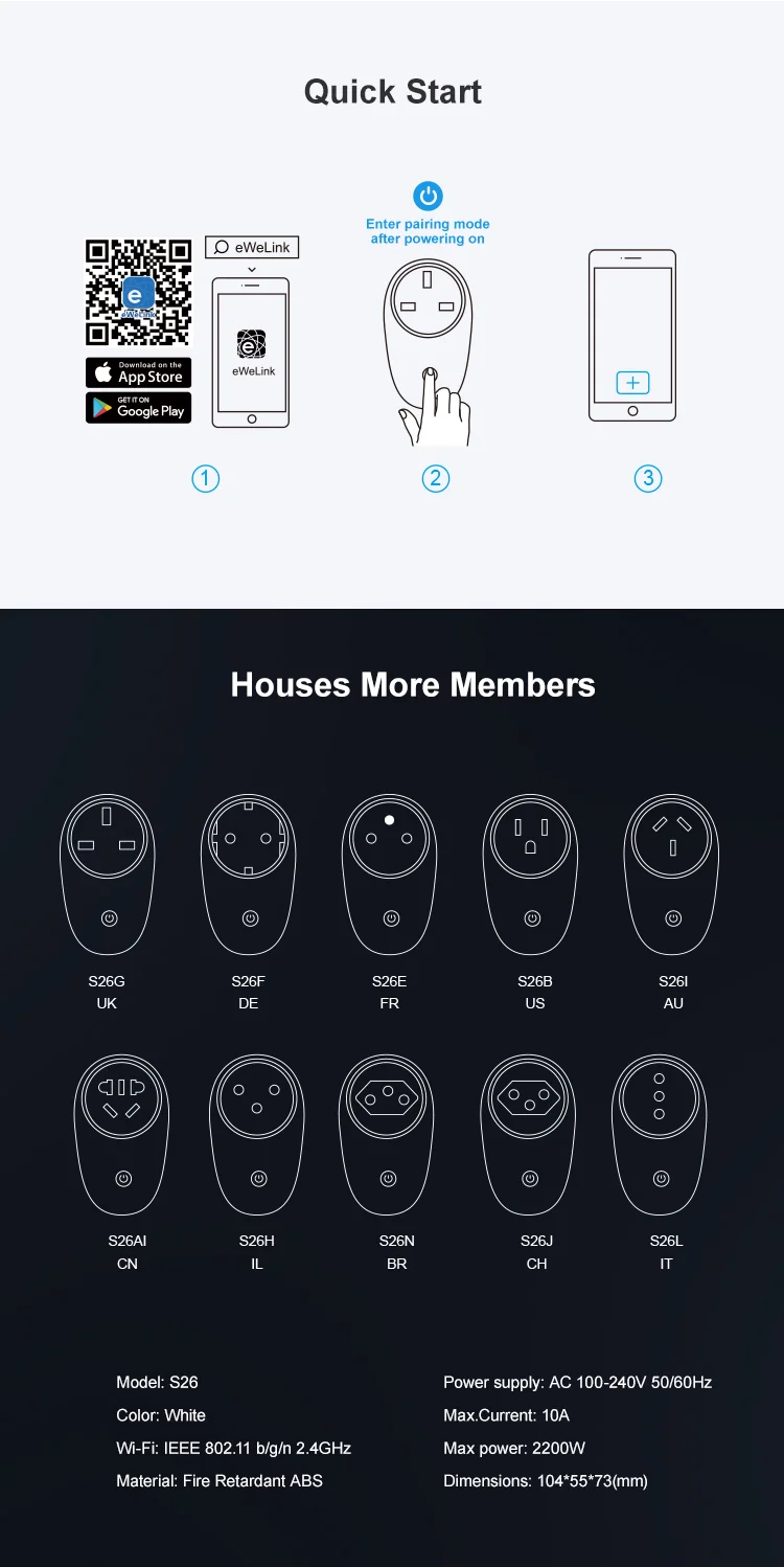 Sonoff S26-это умная вилка Wi-Fi со стандартом EU/US/UK/CN/AU. Пользователи могут мгновенно преобразовать любую вилку в умную розетку с помощью удобной функции таймера, которая работает на смартфоне пользователя. С помощью этой умной розетки вы можете включать/выключать любое подключенное устройство в приложении eWeLink или нажав ручную ручку управления штекером Wi-Fi. Позволяет устанавливать таймеры обратного отсчета/расписания/цикла для автоматического включения/выключения розетки, управляемой Wi-Fi в приложении. Вы можете поделиться вилкой Wi-Fi со своей семьей, чтобы управлять вместе. Просто подключите и уделите минуту для настройки, вы сможете управлять освещением и бытовой техникой из любого места в любое время.