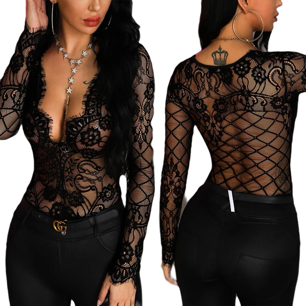 Женский черный блестящий комбинезон с длинным рукавом и глубоким V-образным вырезом, элегантные топы, новинка 2020