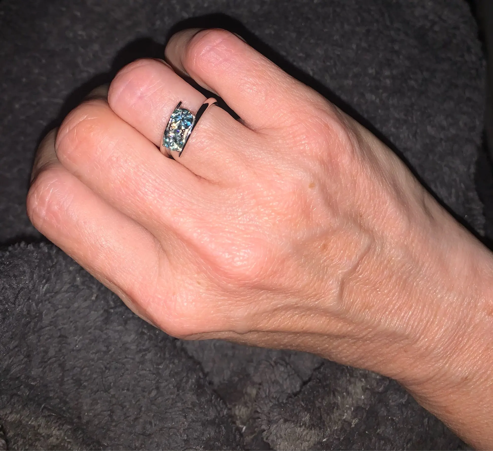 Кольцо имеет голубой прозрачный камень, больше варьируется в зависимости от окружающего света. Очень красивый и очень яркий. Мне понравилось кольцо. Идеальный размер. Продавец отправил товар быстро. Я рекомендую продавцу.