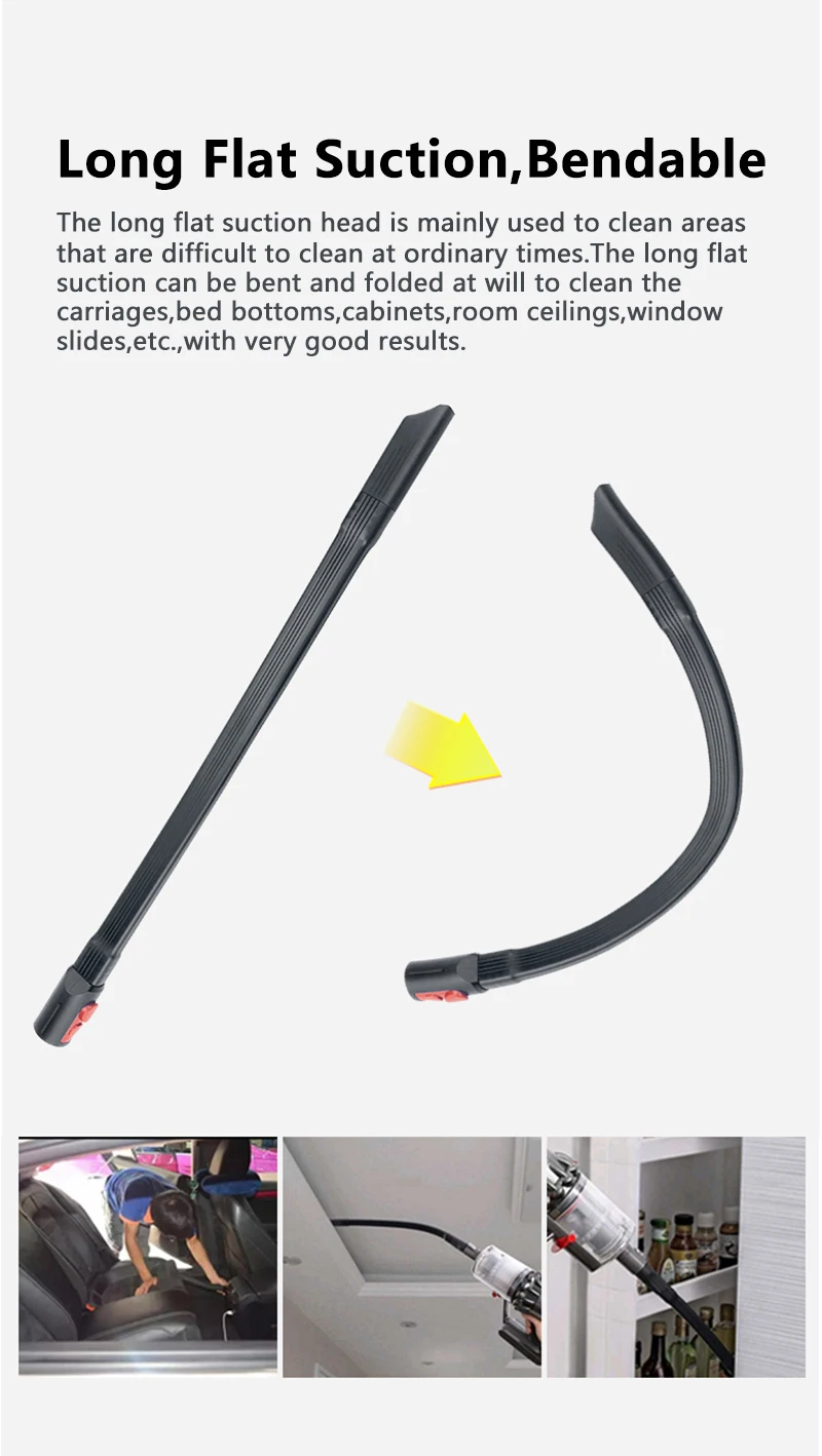 Длинная плоская всасывающая головка в основном используется для очистки областей, которые трудно чистить в обычное время. Длинное плоское всасывание может быть согнуто и сложено по желанию, чтобы очистить коляски, кровати днища, шкафы, комнатные потолки, окна слайды и т. Д., с очень хорошими результатами.