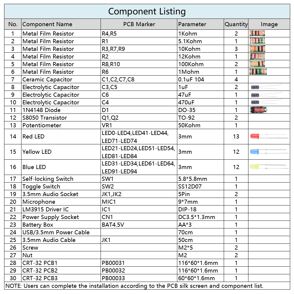 CRT-32 аудио светодиодный Рождественская елка DIY Kit 1. Введение: CRT-32-это набор звуковой рождественской елки, состоящий из печатной платы и позволяющий 37 светодиодов мигать со входным звуком из гнезда 3,5 мм или микрофона и показывать рождественскую елку красным/желтым/синим цветом (в ночное время имеет лучший обзор). CRT-32 изменяет количество света с силой входного звука. Он может имитировать Отображение спектра, а эффект отображения меняется вместе с музыкой. CRT-32 используется для Рождество, торжества, вечеринки и т. д. можно использовать для создания праздничной атмосферы. 2. Особенности: 1>.37 светодисветодиодный для подсветки 2>. Идеальная простая схема 3>. Аудиодисплей с управлением звуком 4>. Поддержка микрофона и аудиовхода 5>. Регулируемая чувствительность 6>. Два режима отображения 3. Параметры: 1>. Название продукта: Набор для самостоятельной сборки звукосветодиодный светодиодной елки CRT-32 2>. Номер товара: CRT-32 3>. Рабочее напряжение: 4,0 в ~ 5,0 В постоянного тока 4>. Рабочий ток: 60 мА 5>. Тип питания: батарейный отсек и розетка 3,5 мм 6>. Рабочий модуль: переключатель управления 7>. Цвет: красный/желтый/синий светодиод 8>. Аудиовход: аудиоразъем 3,5 мм и микрофон 9>. Рабочая температура:-40 ℃ ~ 85 ℃ 10>. Рабочая влажность: 5% ~ 85% относительной влажности 11>. Размер (установлено):135*60*60 мм 4. Функция: 1>. Выполните правильную установку в соответствии с этапами установки. 2>. Вводите правильное рабочее напряжение от аккумуляторного отсека или разъема питания 3,5 мм. 3>. Нажмите самоблокирующийся переключатель SW1, чтобы включить или выключить рабочее Питание: 3,1>.CRT-32 находится в рабочем состоянии, когда ключ заблокирован. 3,2>.CRT-32 выходит из рабочего состояния после отключения ключа. 4>. Он поддерживает микрофон и аудиоразъем 3,5 мм. 4,1>.CRT-32 получает звук с микрофона, когда аудиокабель не подключен. 4,2>.CRT-32 получает звук из аудиоразъема 3,5 мм при подключении аудиокабеля. Аудиоразъем 4,3>. 3,5 мм имеет более высокий приоритет, чем микрофон. 5>. Установите и измените режим отображения с помощью переключателя SW2. 5,1>. Режим точечного отображения светодиодный ода: светодиод в самой высокой точке звука включается, но другой светодиодный выключен. 5,2>. Режим отображения светодиодный ных линий: горят все светодиодный ы, соответствующие интенсивности звука. 5,3>. Эффект эталонного отображения более очевиден в двух режимах отображения. 6>. Поверните потенциометр VR1 для регулировки на чувствительность к звуковым волнам. 5. Применение: 1>. Обучение навыкам сварки 2>. Студенческая школа 3>. Производство своими руками 4>. Дизайн проекта 5>. Электронный конкурс 6>. Подарок 7>. Коллекция поделок 8>. Украшение для дома 9>. Коллекция сувениров 10>. Дизайн выпускного 11>. Праздничные подарки 6. Советы по установке: 1>. Сначала пользователю необходимо подготовить сварочный инструмент. 2>. Будьте терпеливы до завершения установки. 3> посылка комплект входит набор «сделай сам». Пользователем необходимо закончить установку. 4>. Паяльник не может прикасаться к компонентам в течение длительного времени (1,0 секунды), иначе это приведет к повреждению компонентов. 5>. Обратите внимание на положительный и отрицательный вид компонентов. 6>. Строго запрещает короткое замыкание. 7>. Пользователь должен установить светодиодный в соответствии с указанными правилами. В противном случае некоторые светодиодный ы не светильник тся. 8>. Уст