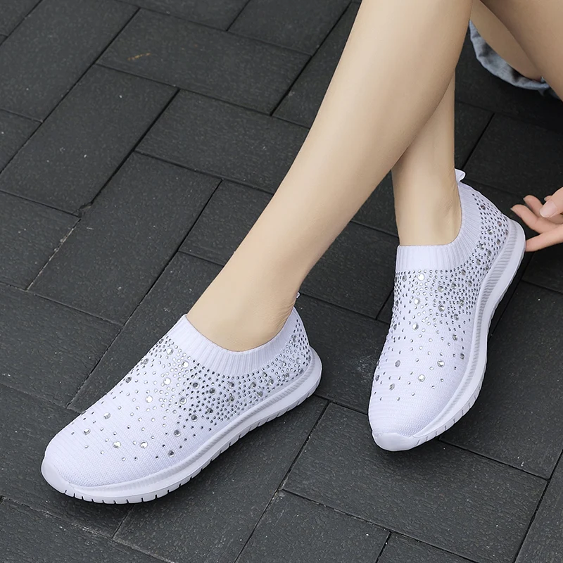 Кроссовки женские без шнуровки, блестящие спортивные сникерсы с кристаллами, дышащие, стразы, лето