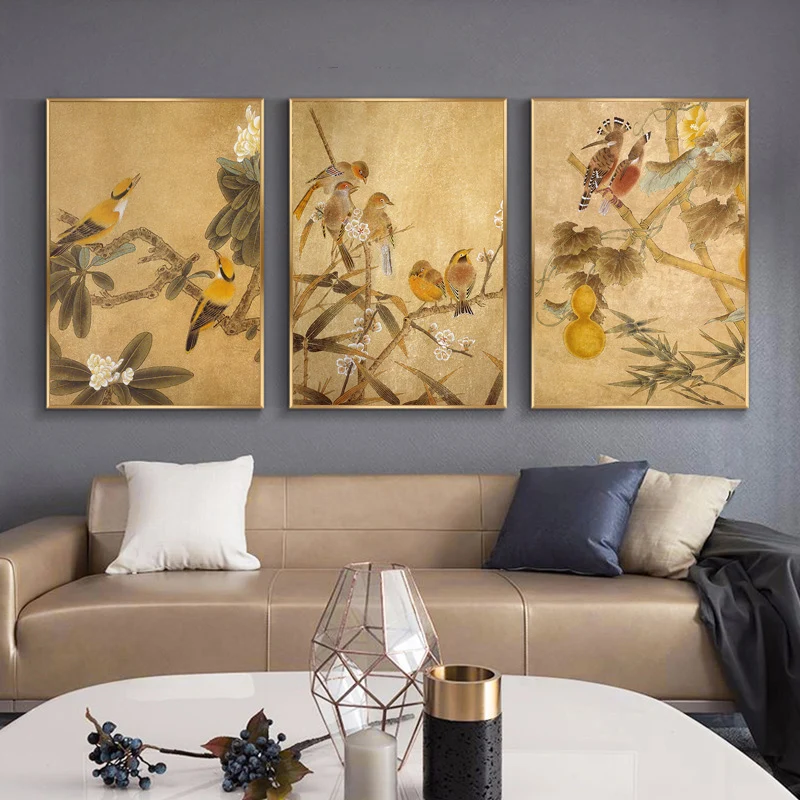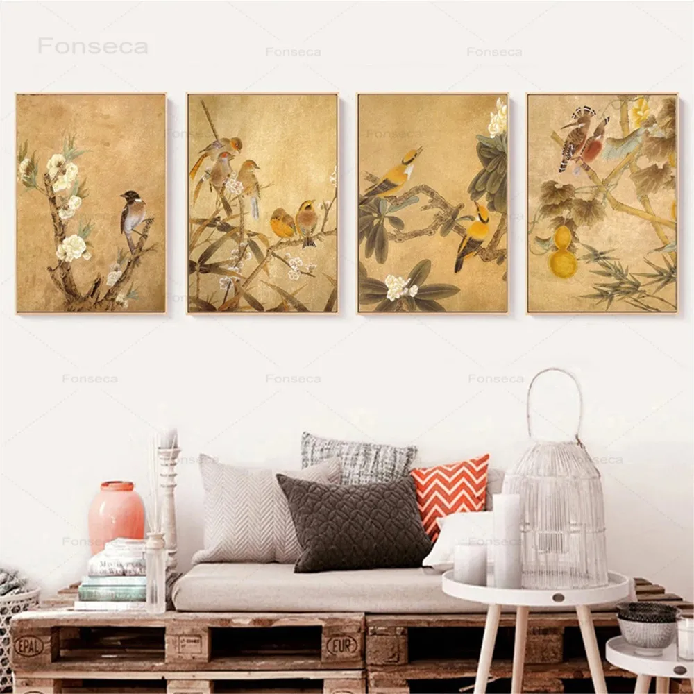 Ретро Птица растение цветок китайская живопись на холсте постеры и принты винтажные настенные картины для гостиной домашний декор
