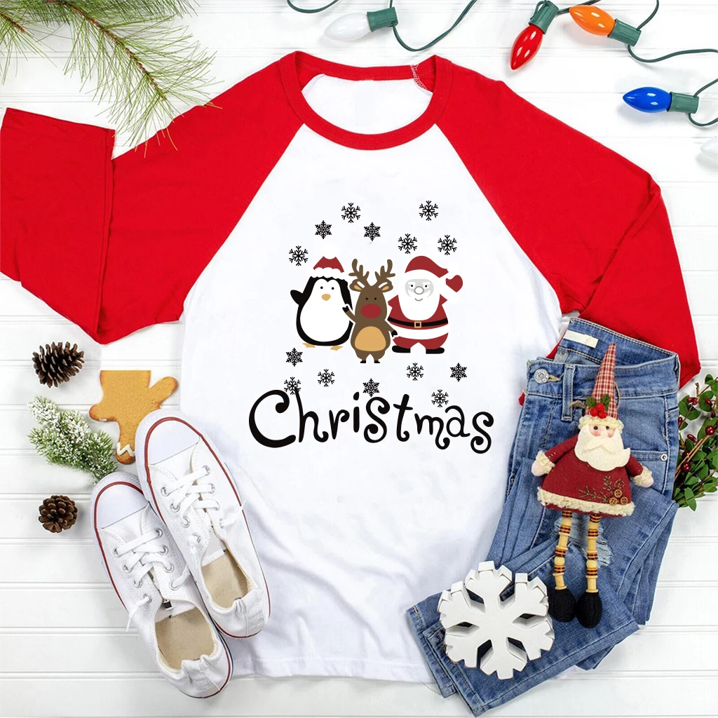 Женская футболка с принтом рождественского оленя и Санты, красная, белая Лоскутная футболка с длинным рукавом, Милая женская модная повседневная футболка