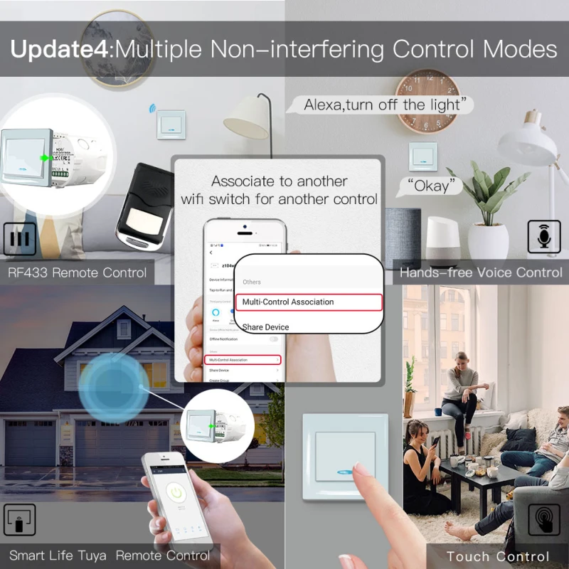 2. Отличается от традиционного обычного переключателя, этот смарт-переключатель может управляться разными способами в отдельности с лучшим значением, таким как управление приложением, сенсорное управление, голосовое управление и даже специально встроенная частота RF433 позволяет использовать другой контроль с помощью радиочастотного пульта дистанционного управления Переключение с кодировкой 1527 без помех; Достичь мульти-контроля, связываясь с другими смарт-переключателями в приложении smart Life, кроме того, его собственный модуль используется в качестве цепи 1/2 (2 переключателя управляют 1 светильник).(Примечание: 433 RF пульт дистанционного управления не входит в посылка, пожалуйста, приобретайте отдельно.)