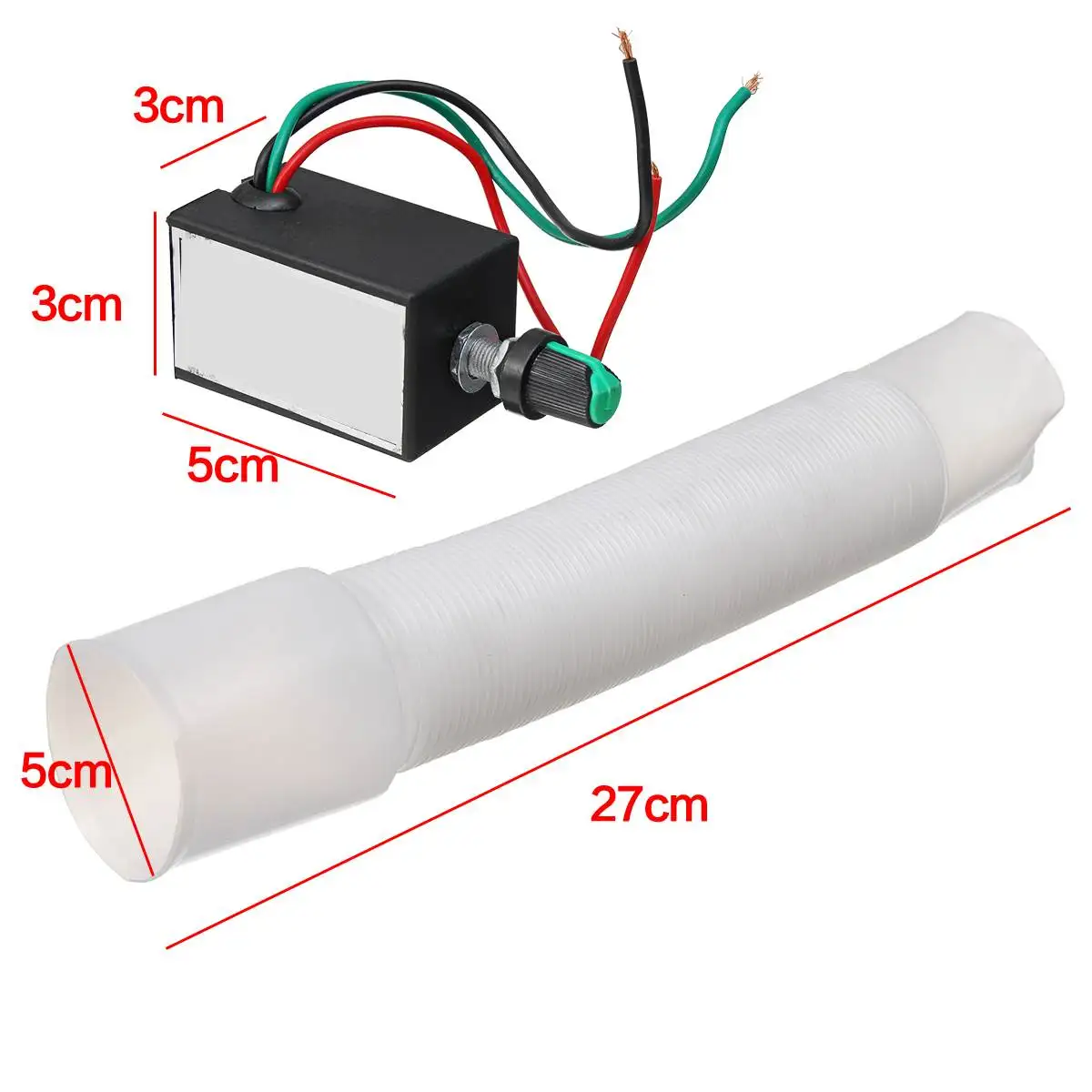 Модель: A02415Описание товараМатериал: пластикЦвет: черно-белая трубкаРазмер трубы: 27x5смПереключатель скорости: 3x3x5 смНапряжение: 12 В, 24 В универсальное